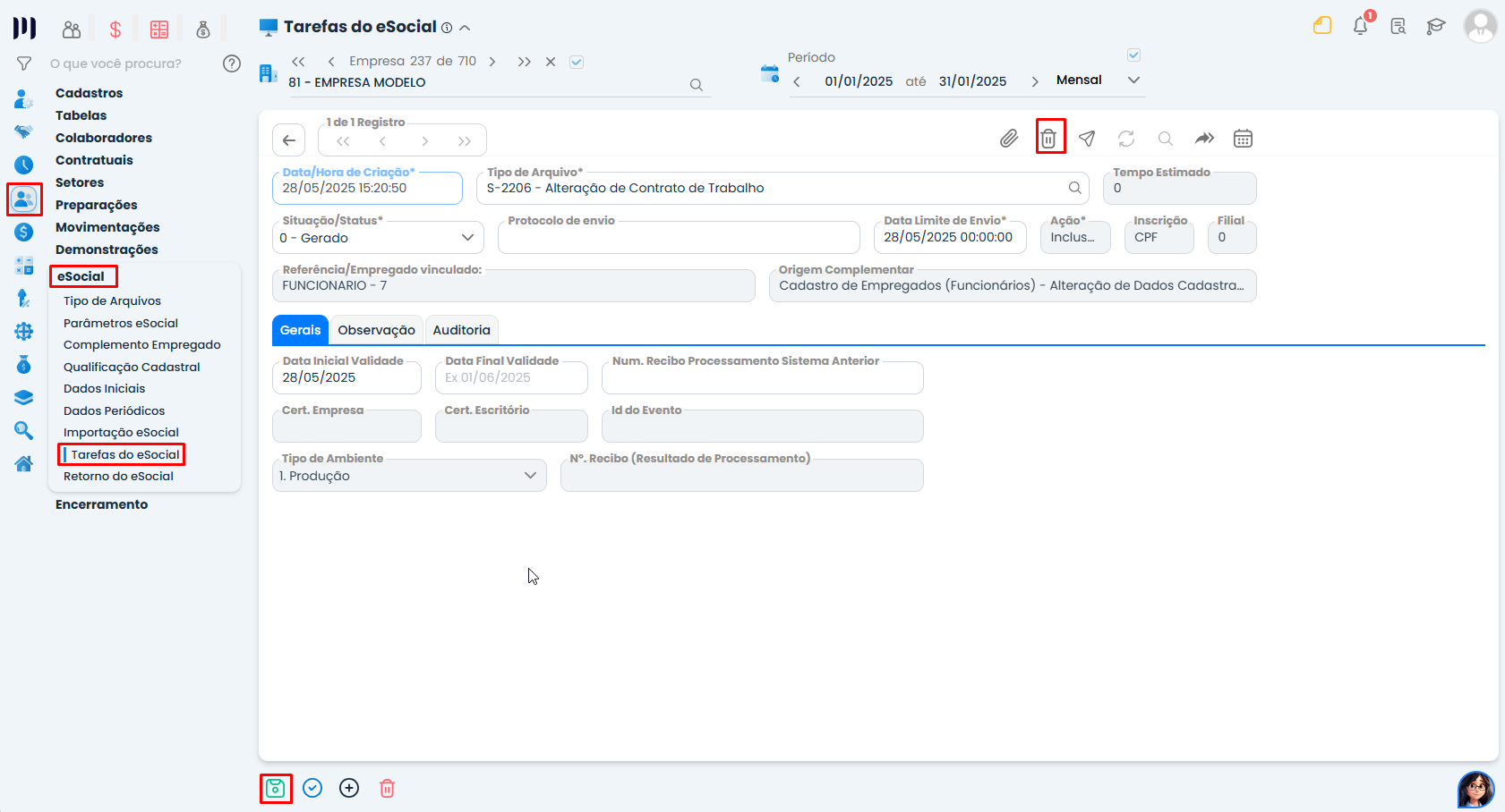 Passo 3: Limpe o evento de alteração de categoria, excluindo os eventos evento S‑2206 ou S‑2306 previamente gerado (caso existam).