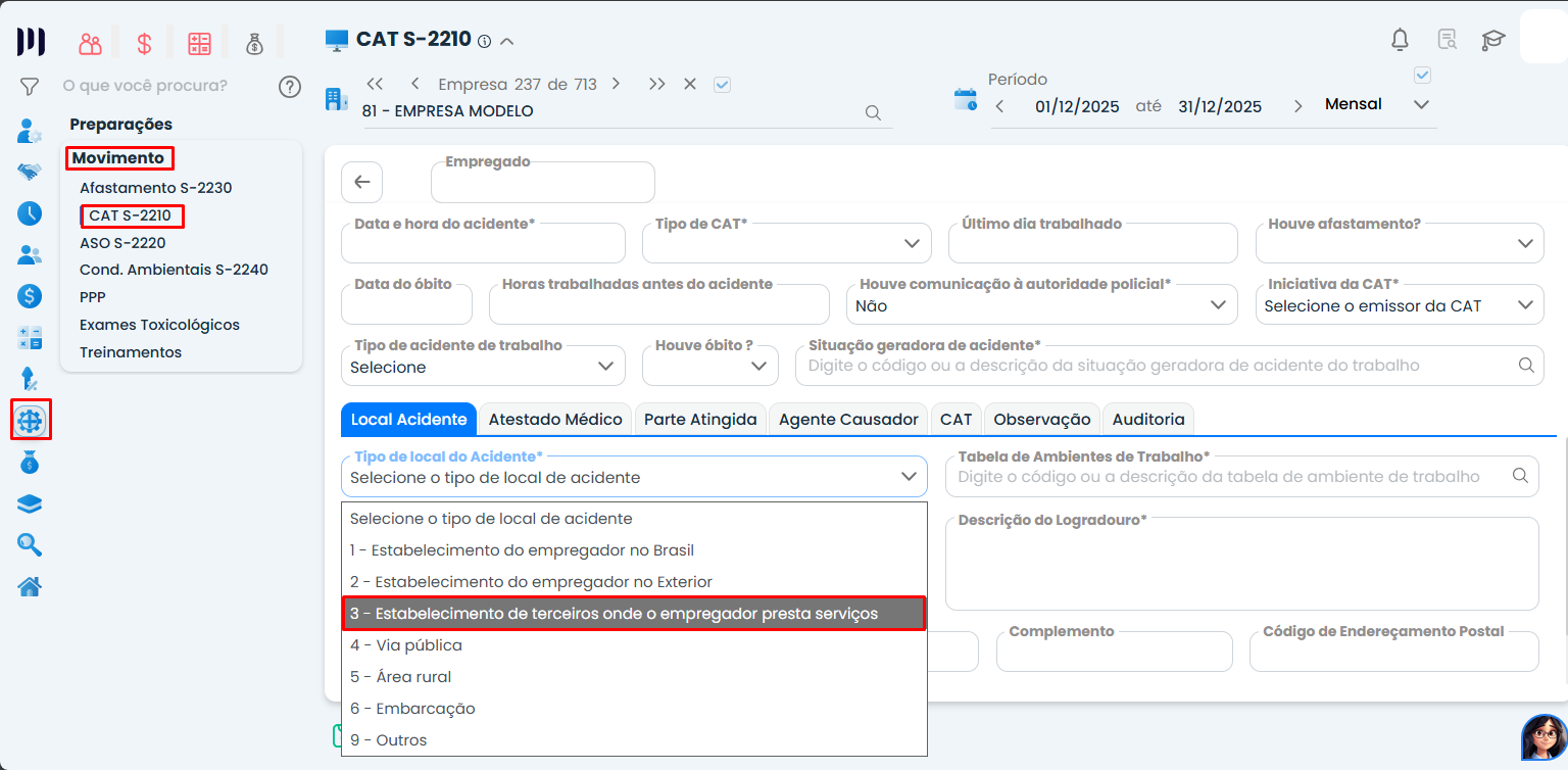 Passo 1: Acesse o menu SESMT, depois Movimento e selecione CAT S-2210.