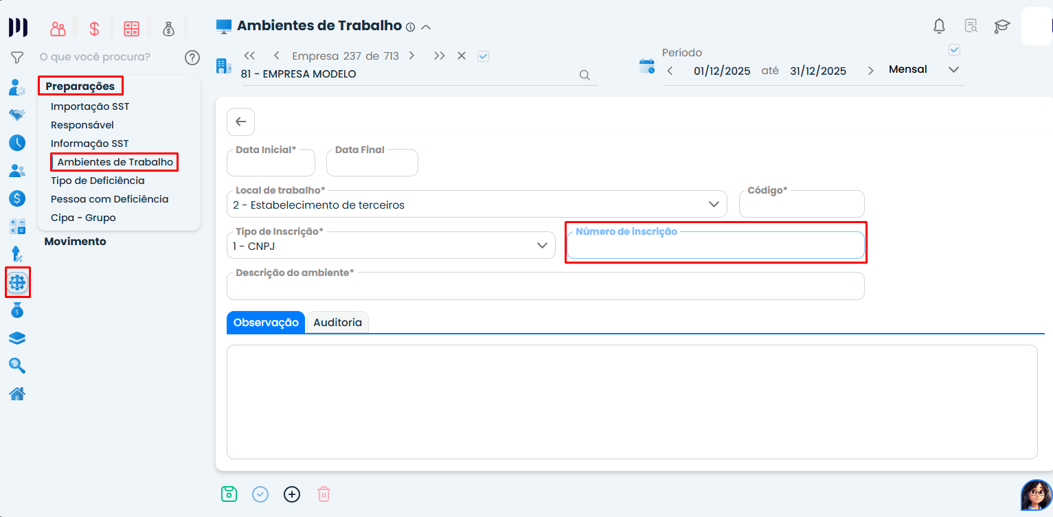 • Se estiver como 3 (local de terceiro), cadastre o CNPJ do terceiro no Ambiente de Trabalho.