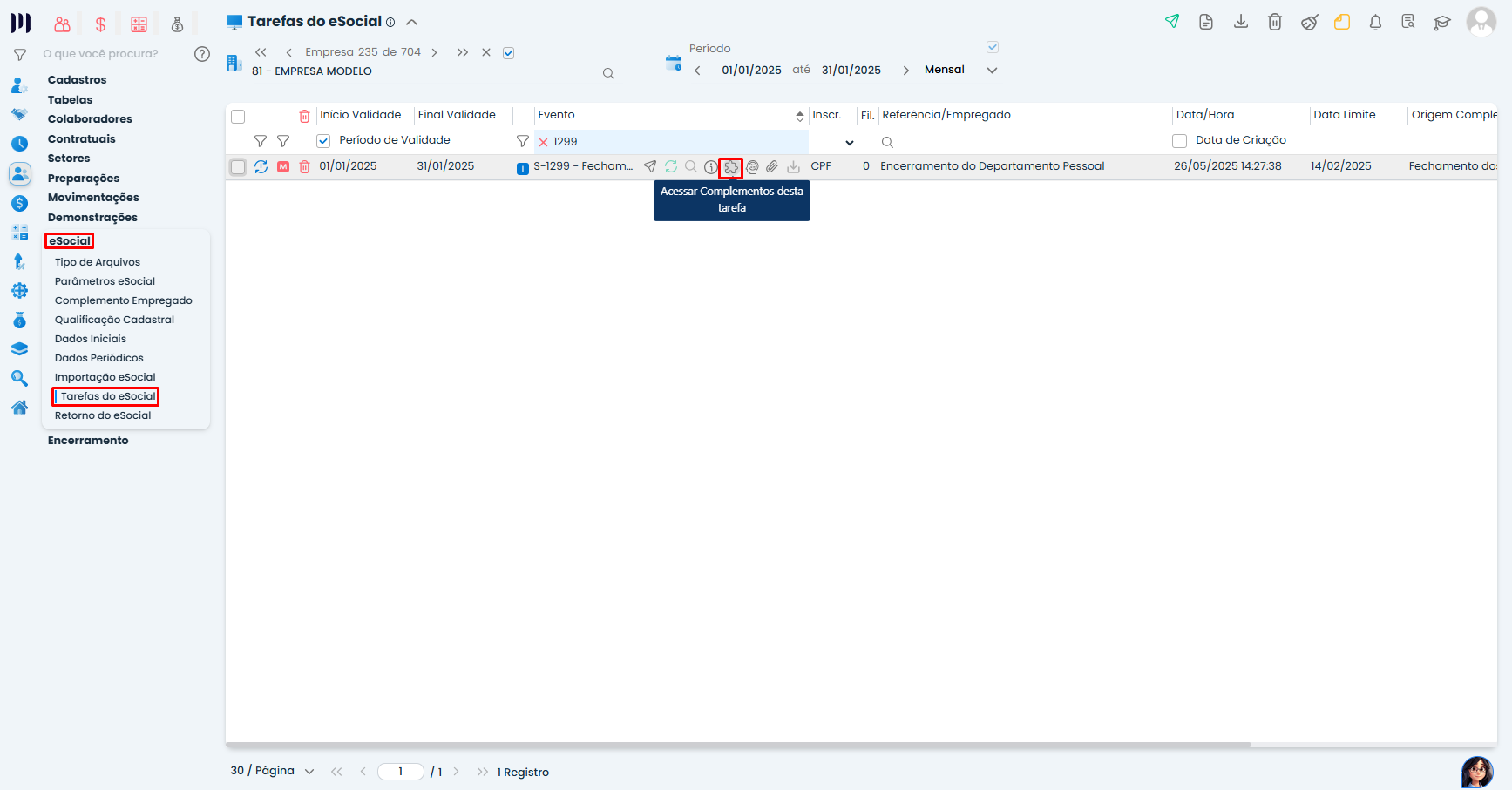 - Acesse o evento S-1299 no sistema, na tela de Fechamento da folha.