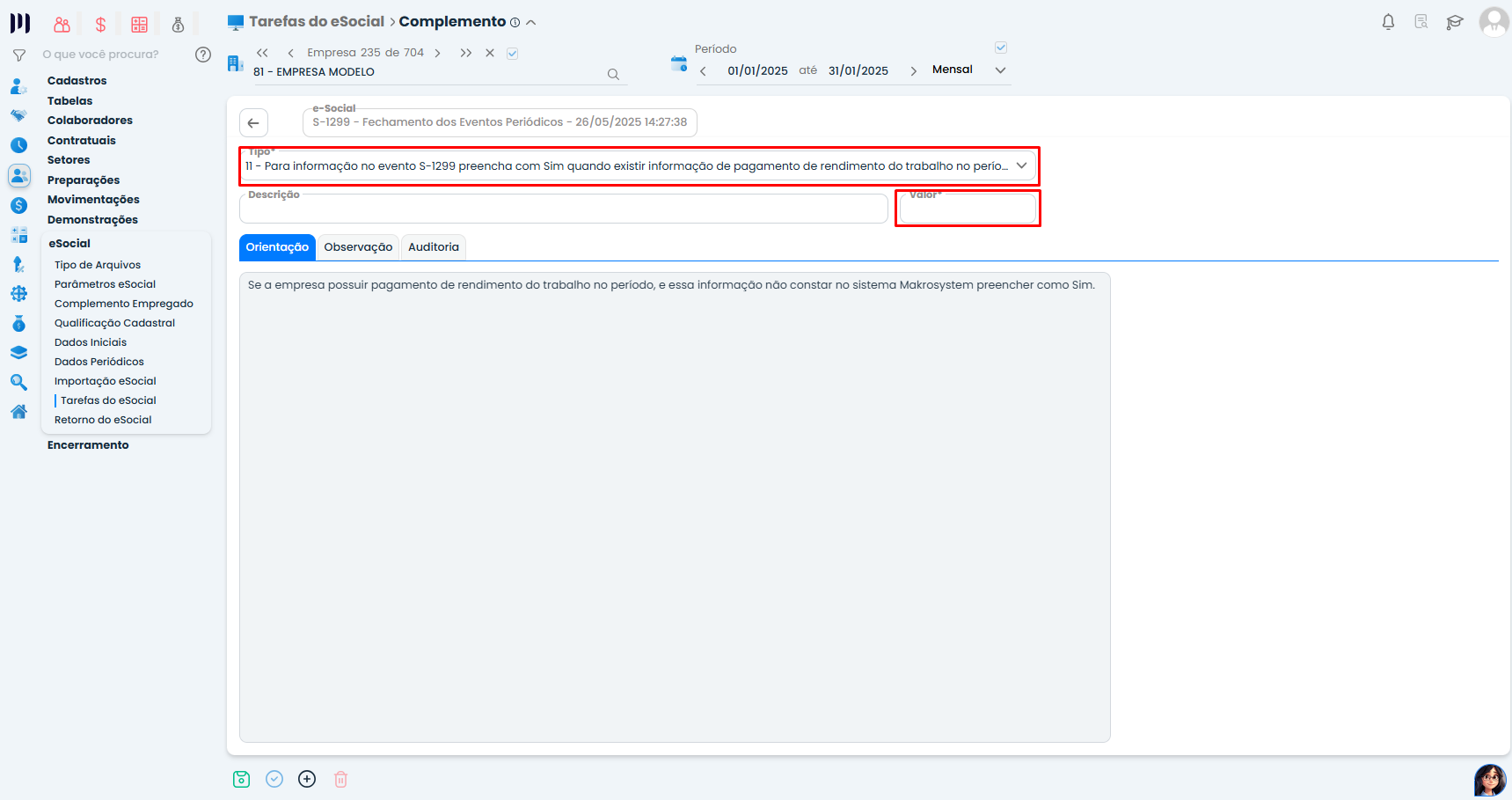 - Localize a opção para incluir complemento dentro do evento S-1299.
