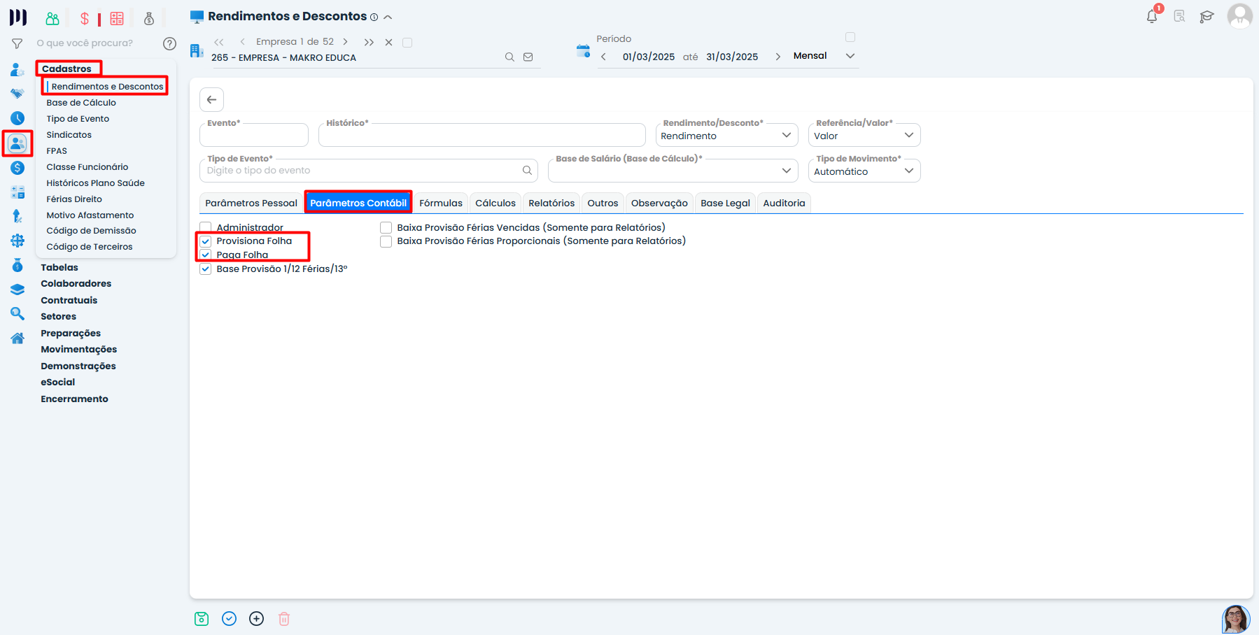 Eventos sem marcação “Provisiona/Paga Folha”, nem todos deve estar selecionados, verificar antes de marcar se tem ou não necessidade de marcar