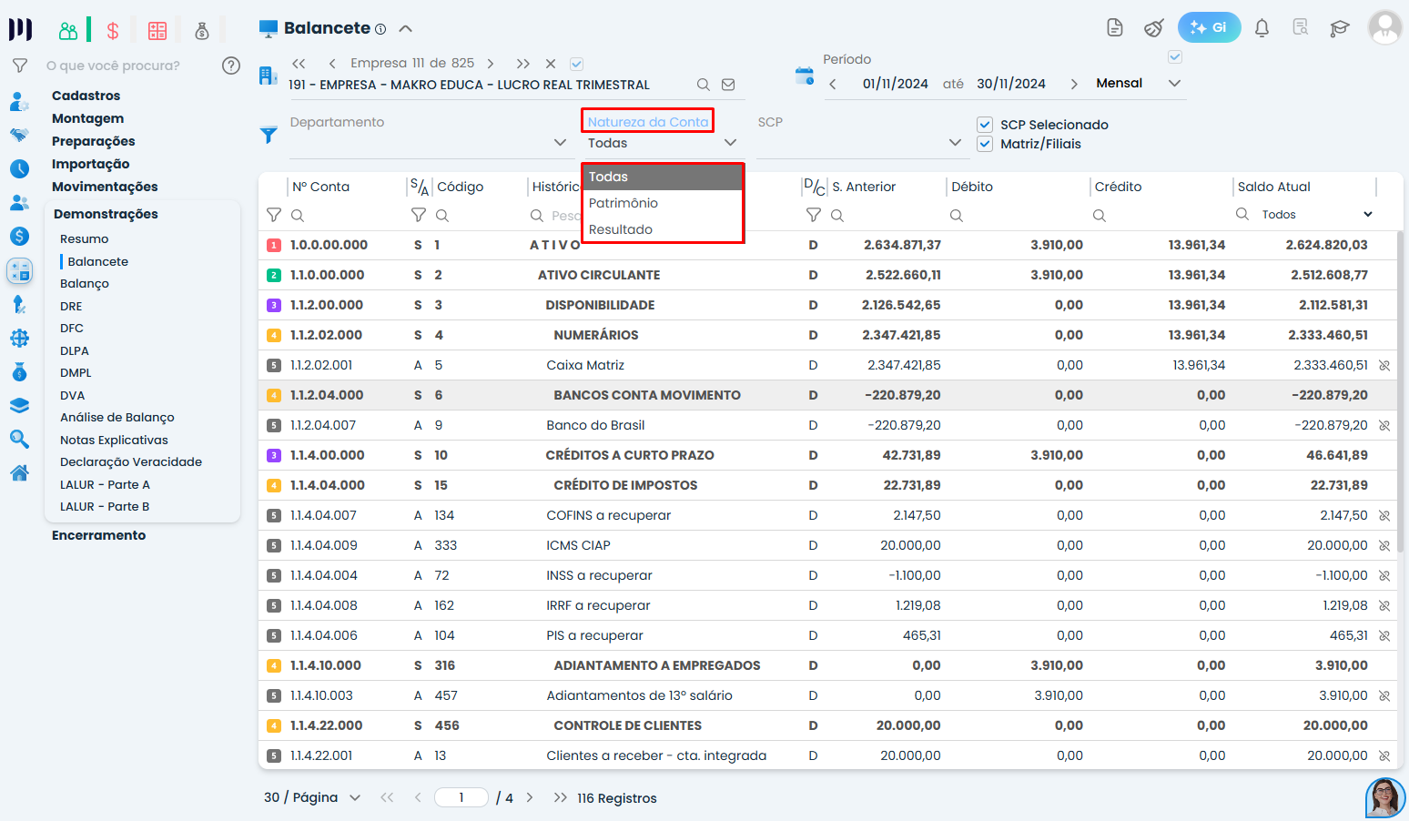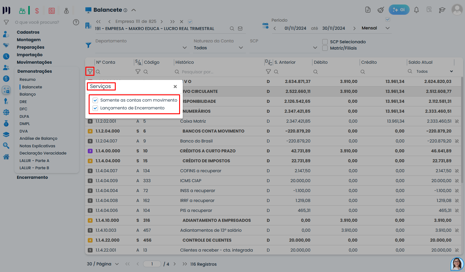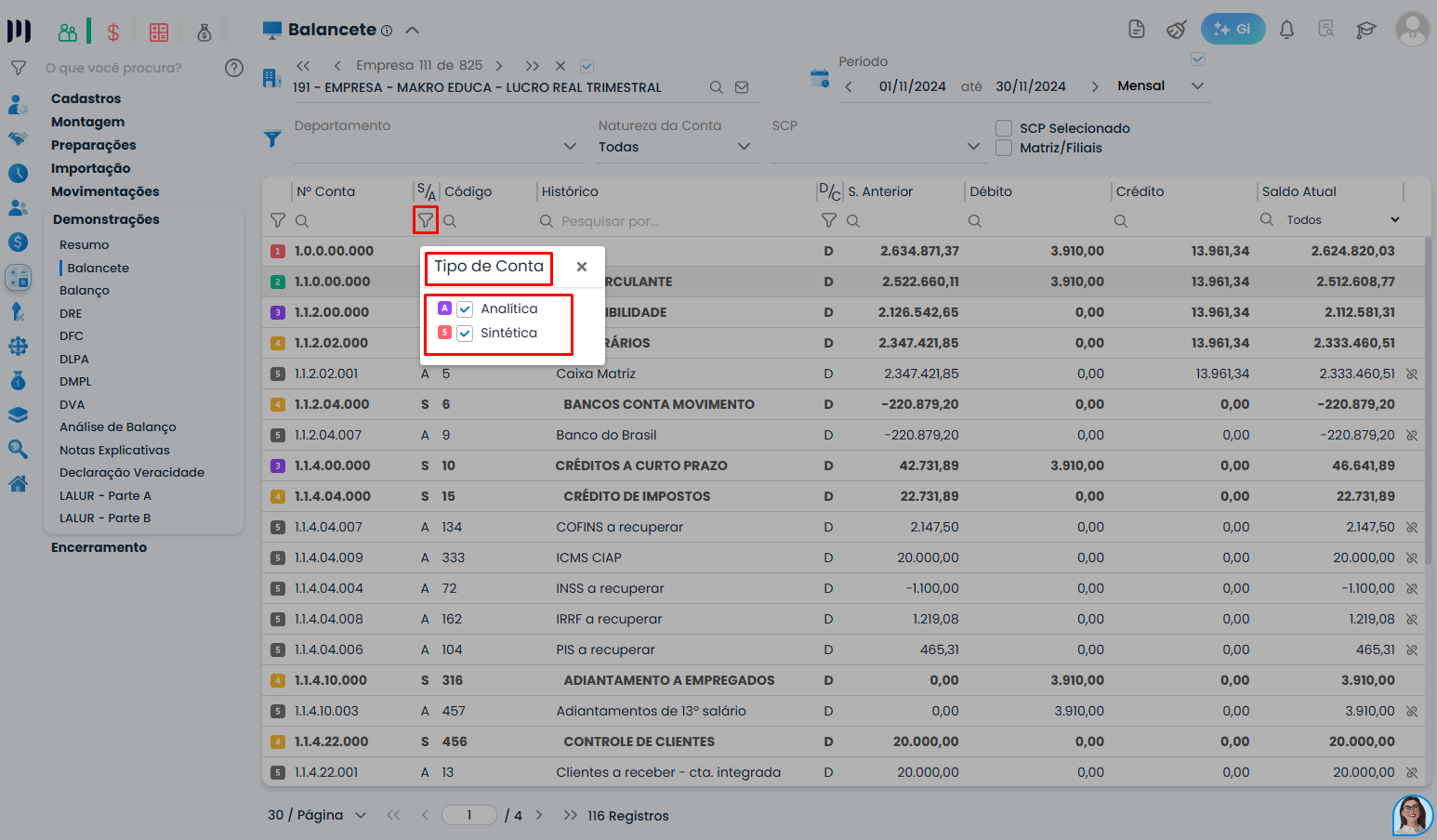 Acesse os filtros em: Contábil > Demonstrações > Balancete