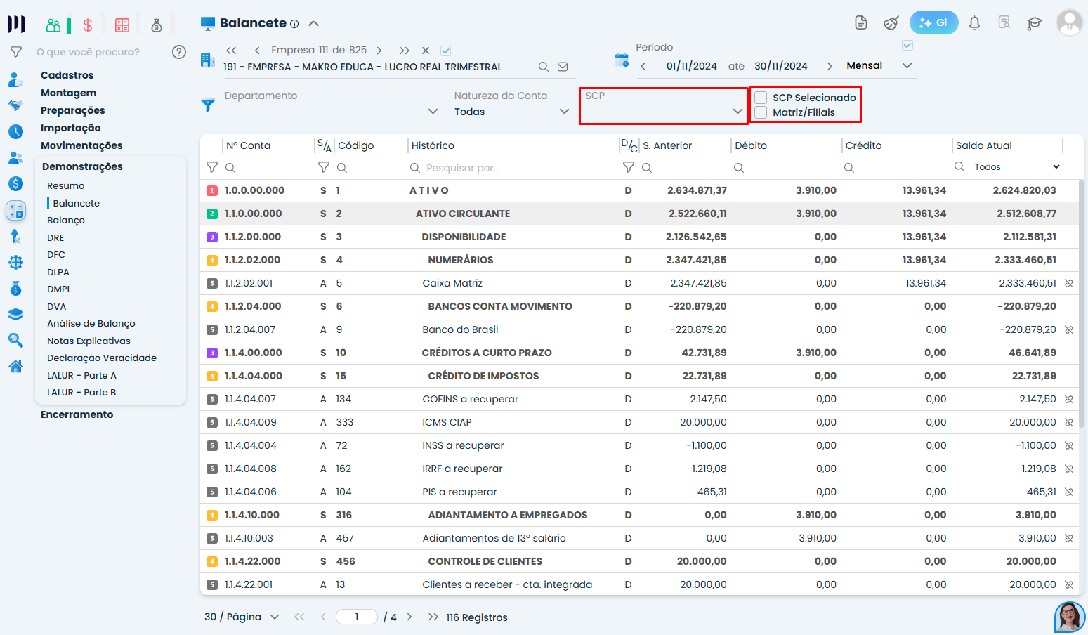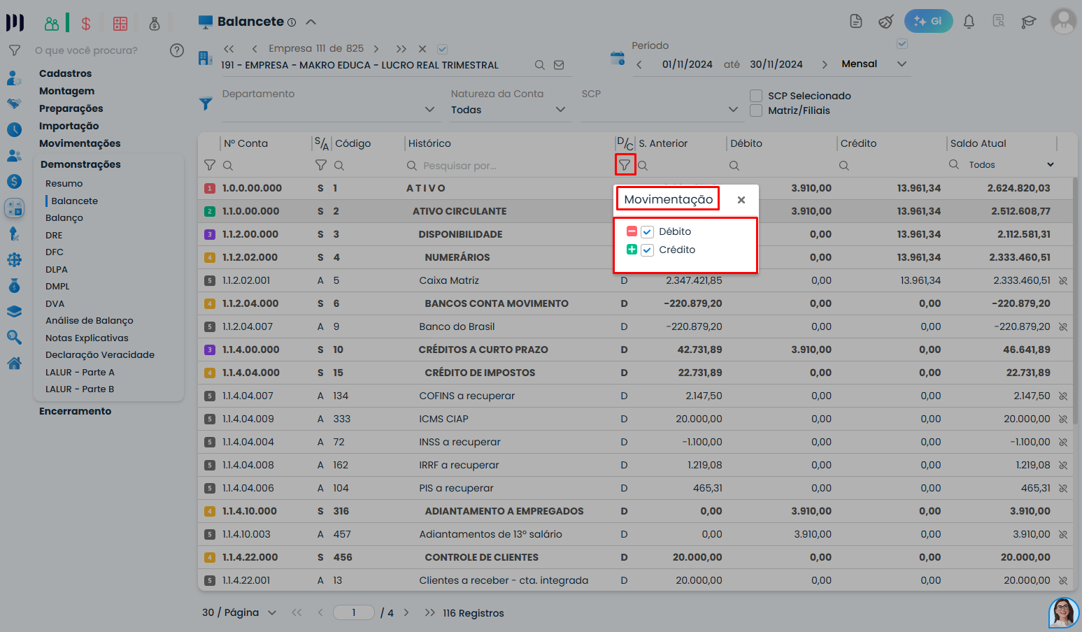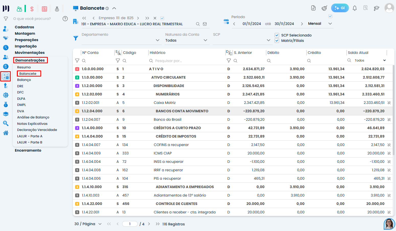 Acesse os filtros em: Contábil > Demonstrações > Balancete