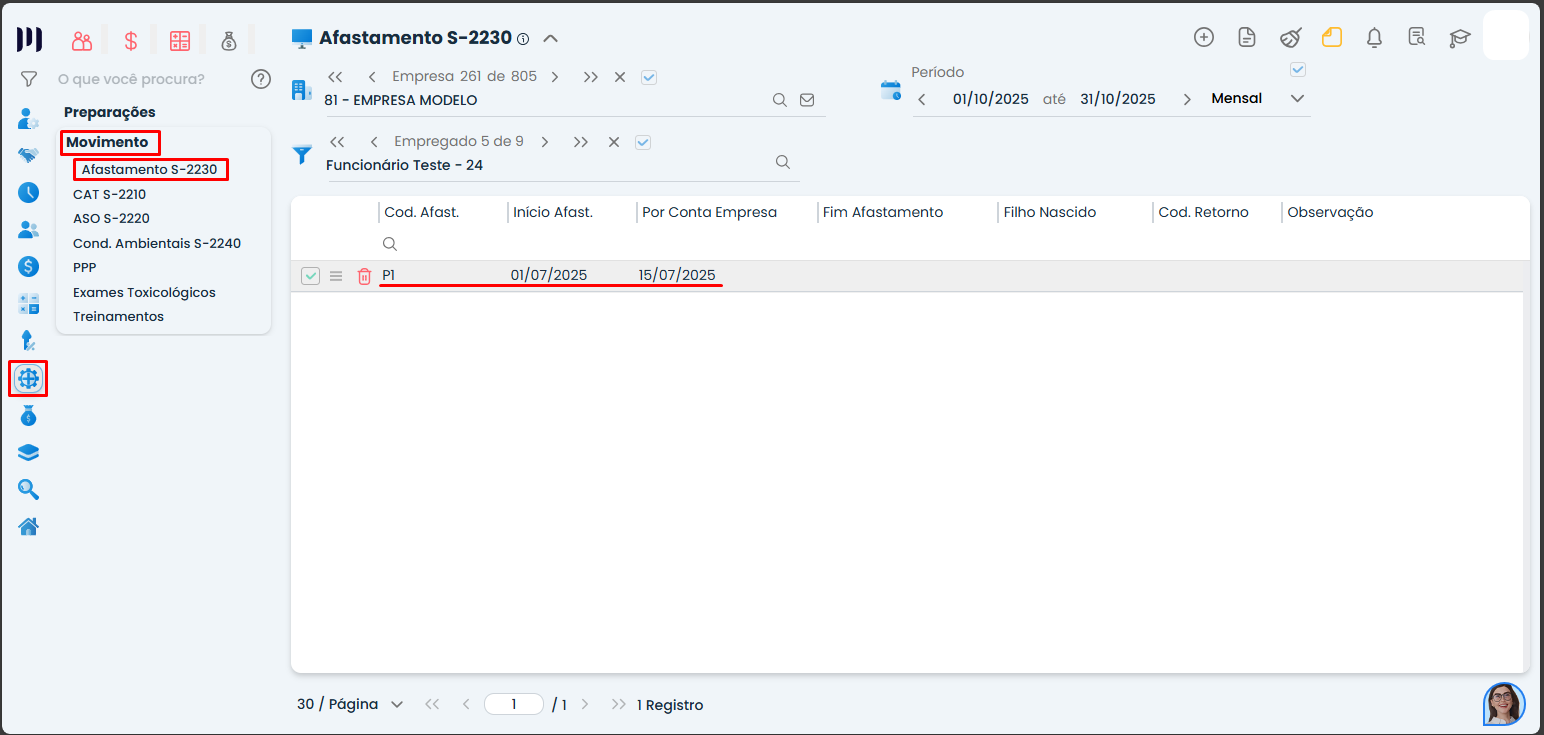 Passo 2: Localize o registro do afastamento do empregado que precisa ser finalizado;