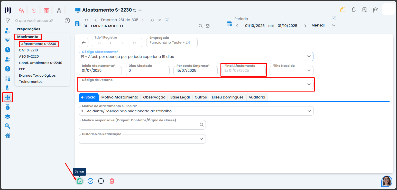 Passo 4: Preencha também o campo ‘Código de Retorno’, conforme o motivo que representa o retorno ao trabalho;