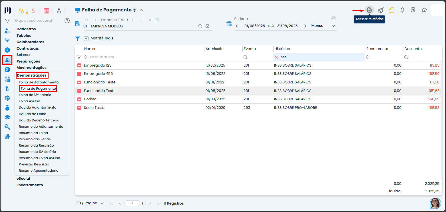 Passo 1: Acesse o menu Pessoal>Demonstrações>Folha de Pagamento;