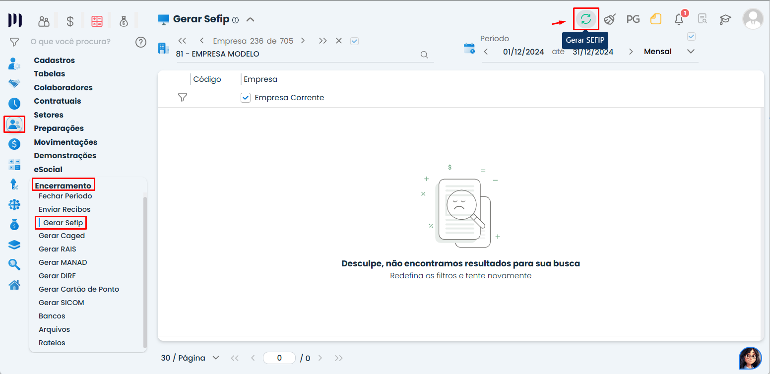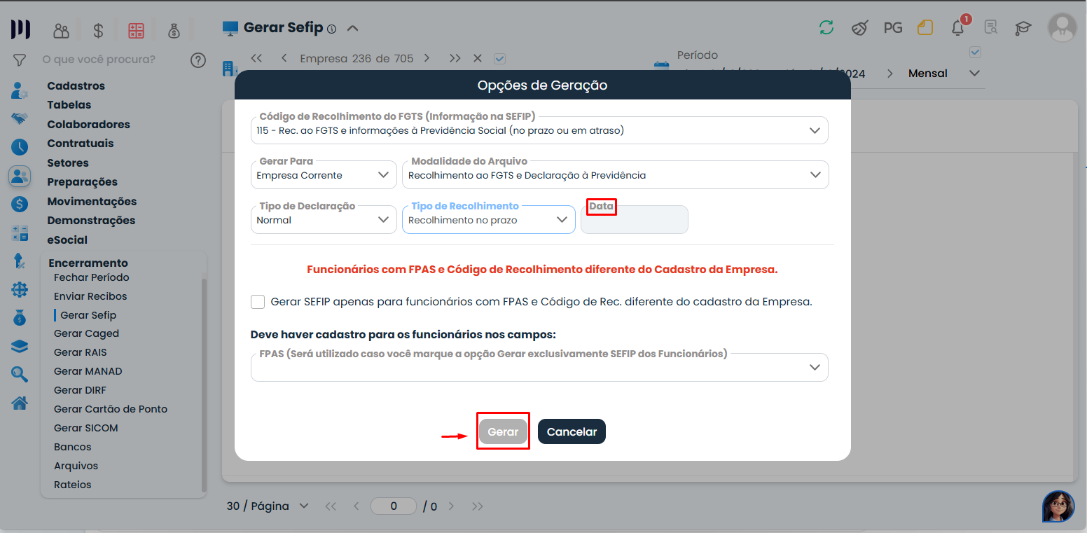 Localize e selecione a opção Gerar SEFIP.