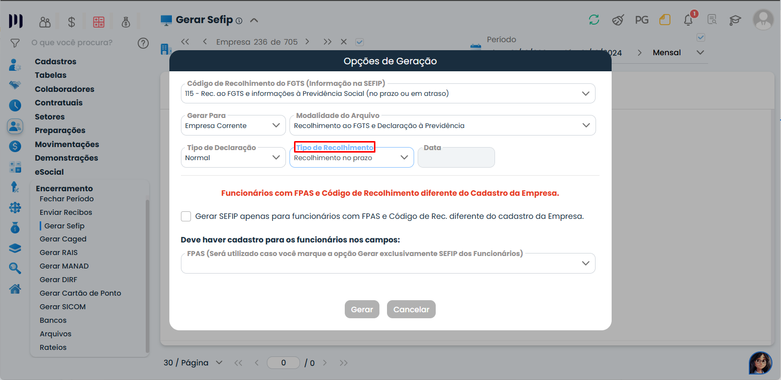 Erros comuns: Se o campo “Tipo de recolhimento” não for preenchido corretamente, o arquivo SEFIP pode não ser gerado como esperado.