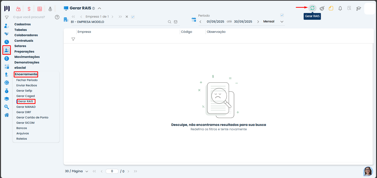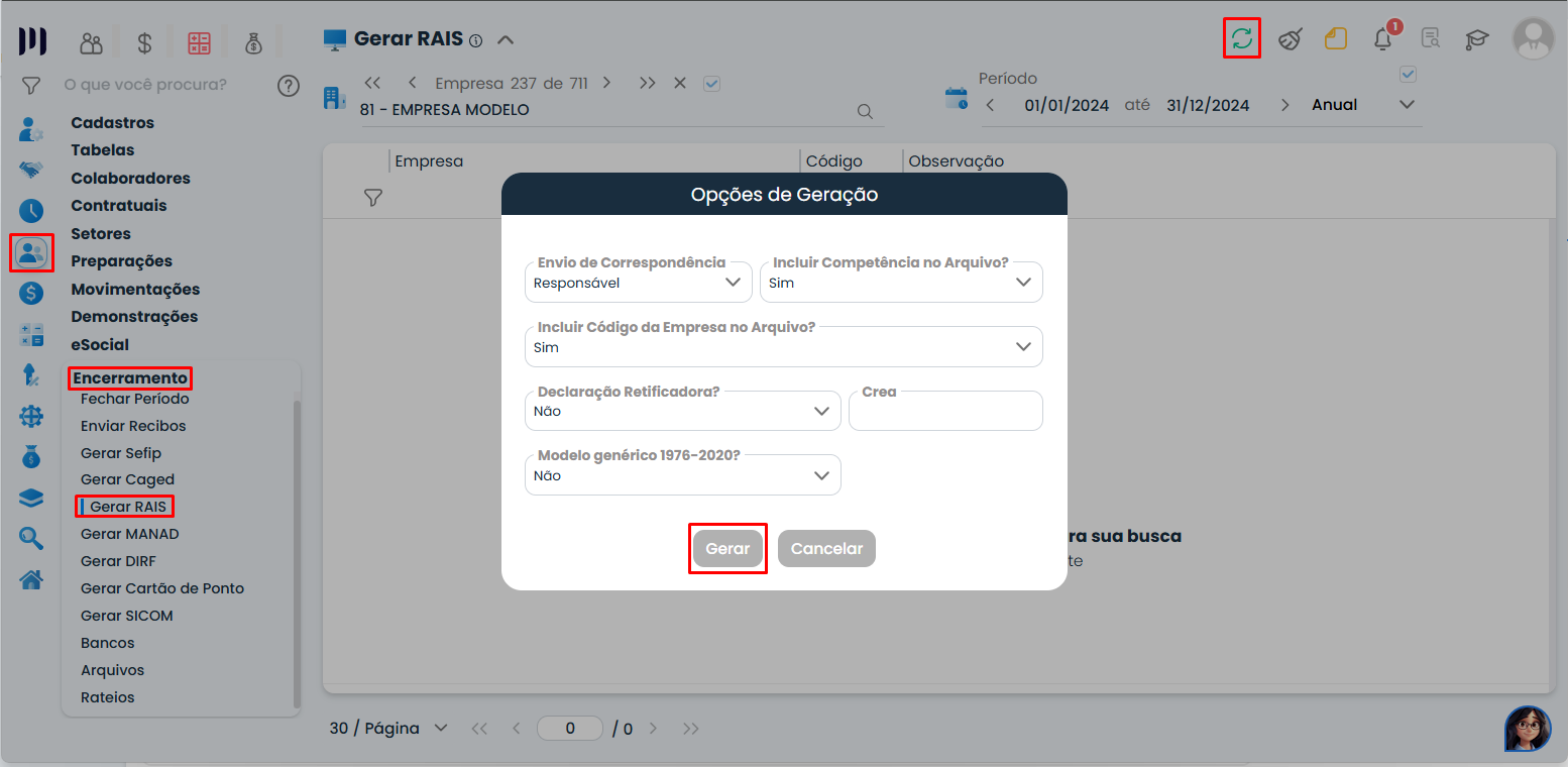Passo 1: Acesse o menu Pessoal>Encerramento>Gerar RAIS;