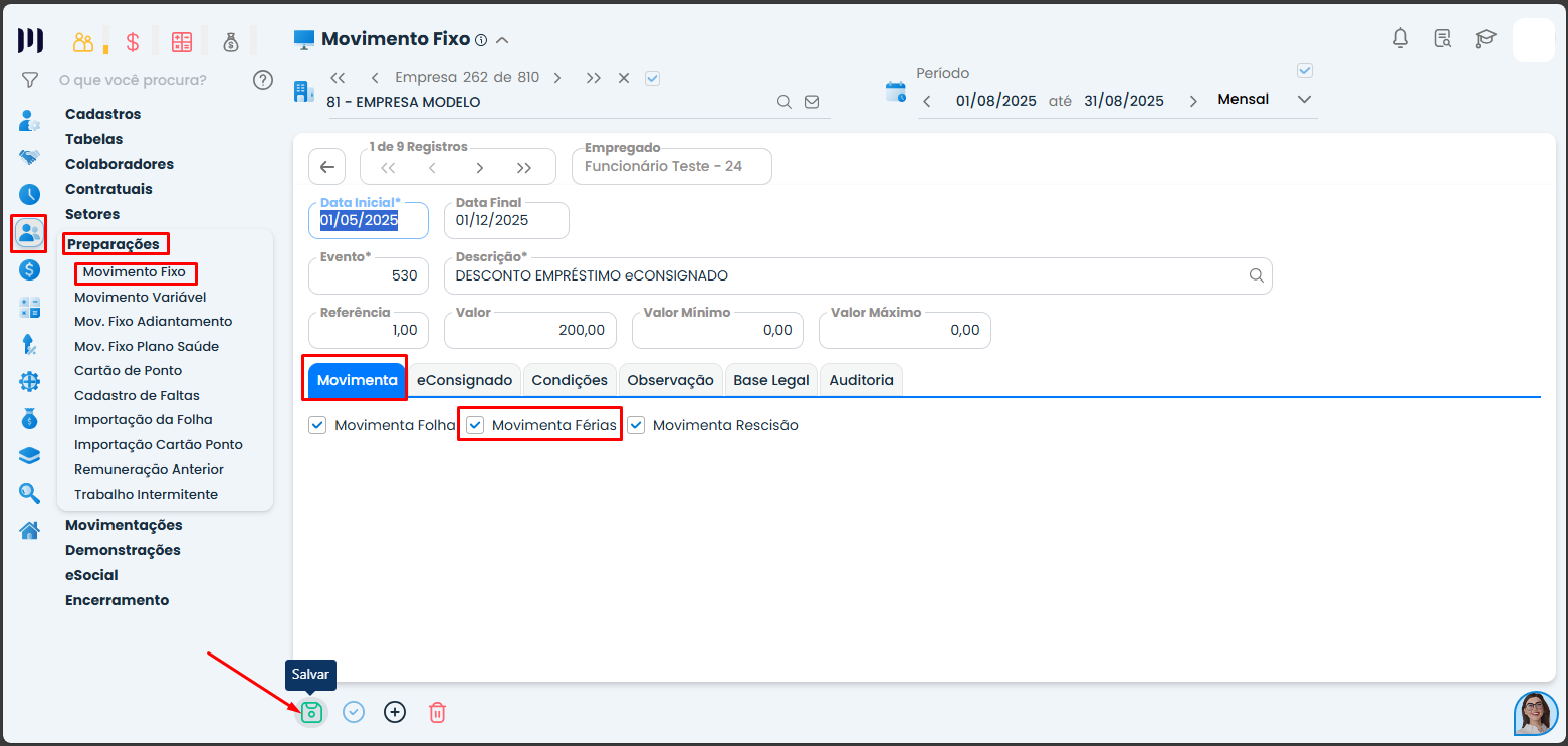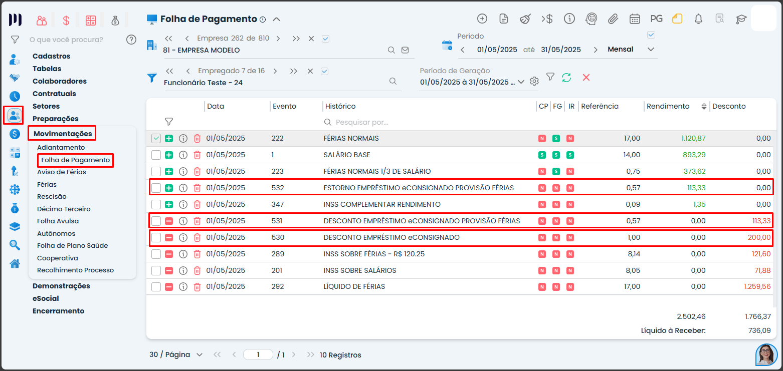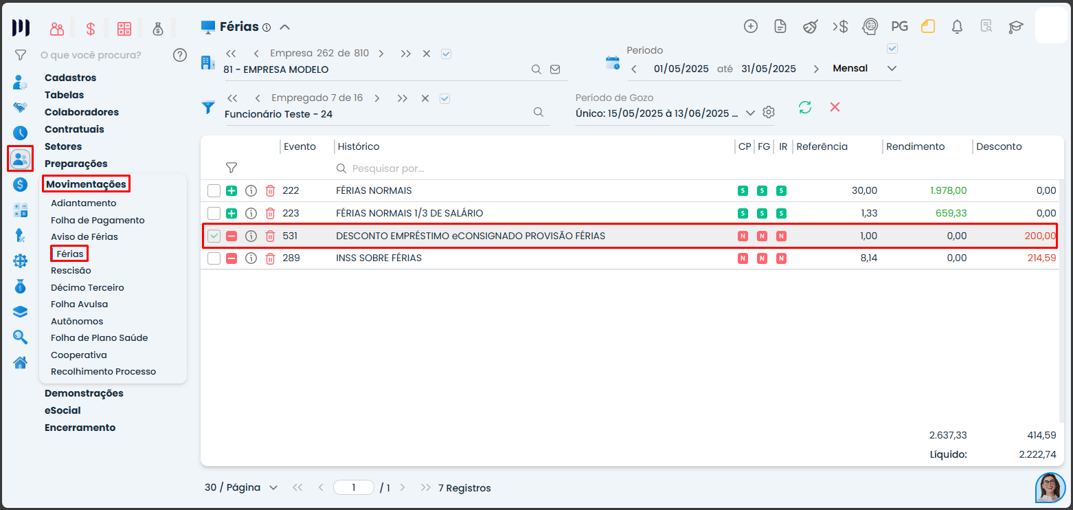 Ao final, a folha de pagamento exibirá corretamente os descontos de empréstimos consignados no período de férias do empregado.