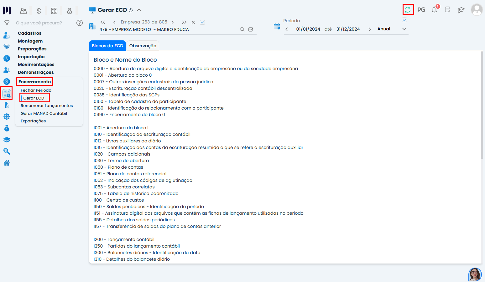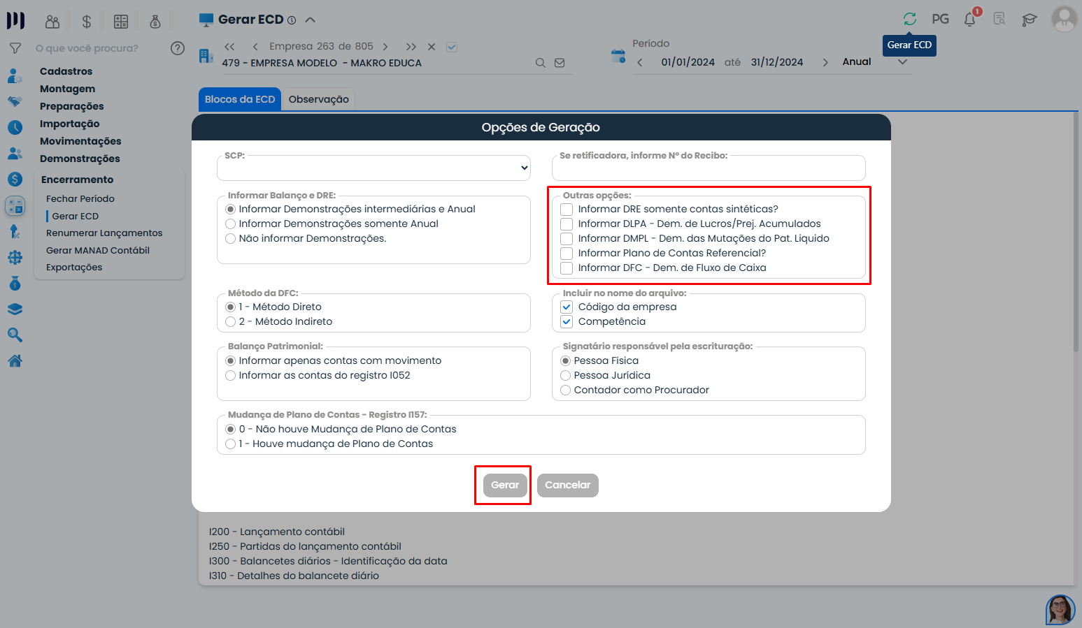 Passo 3: Vá para Contábil > Encerramento > Gerar ECD.