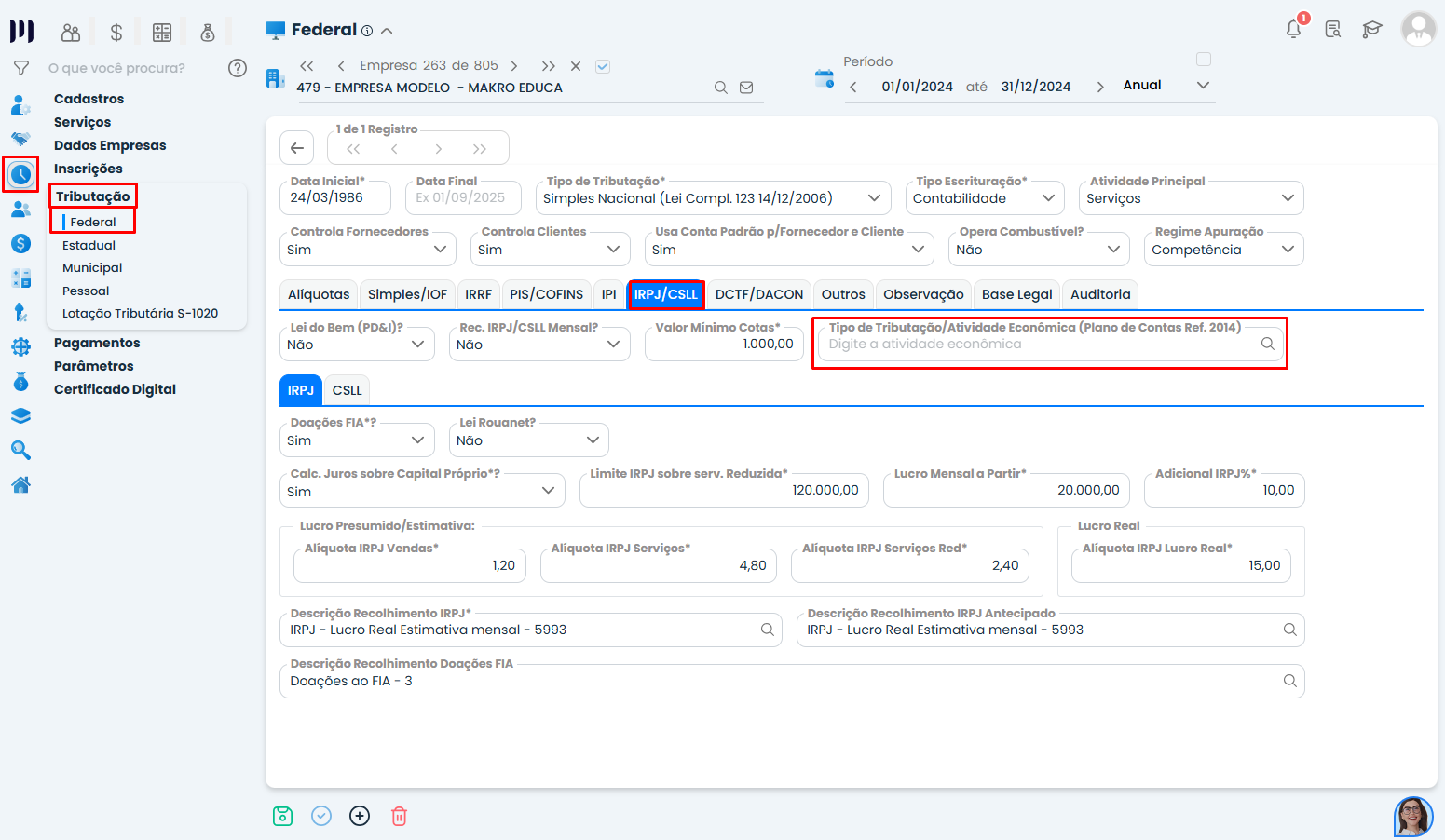 Acesse Preparar > Tributação > Federal > Aba IRPJ/CSLL.