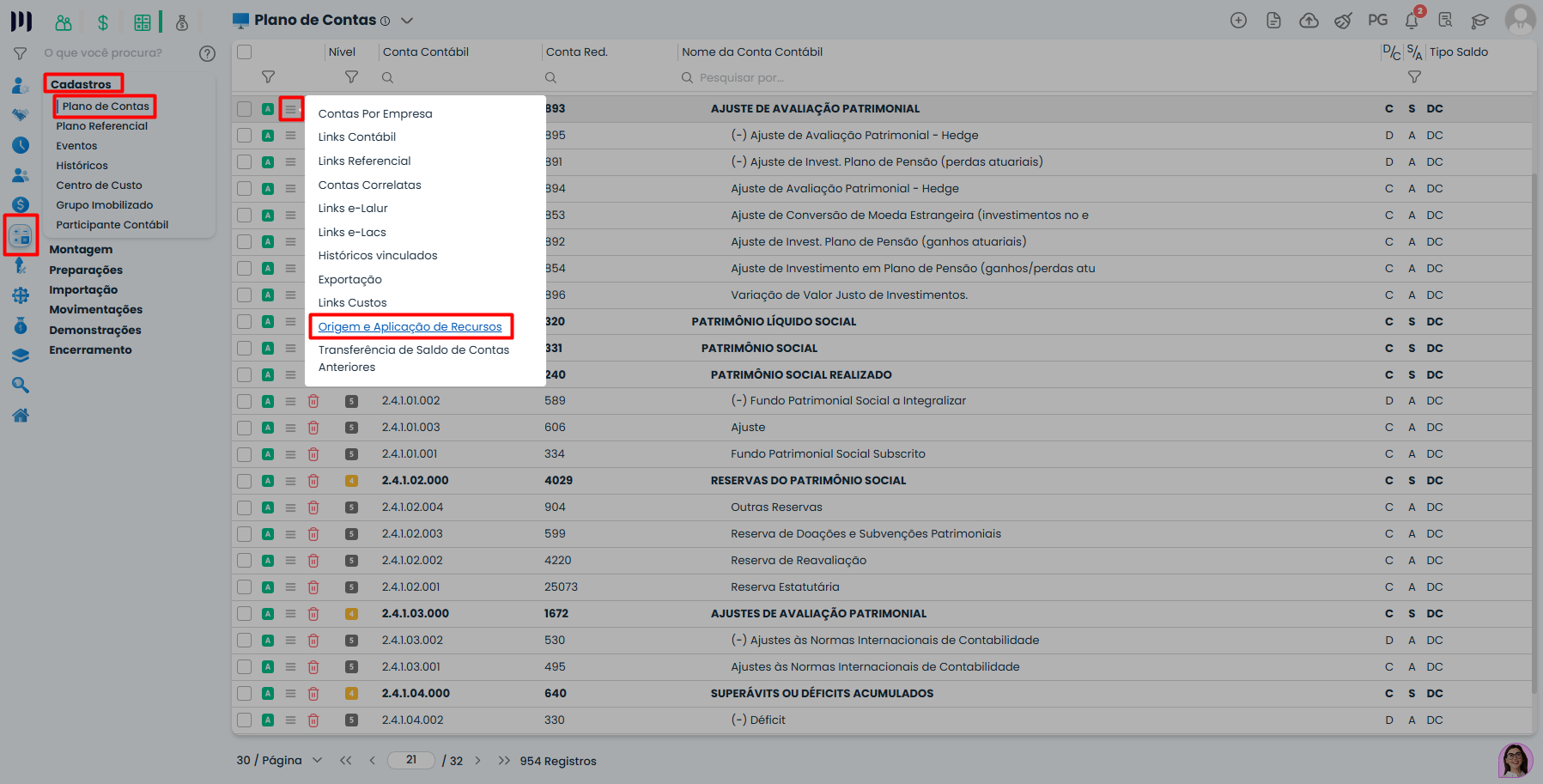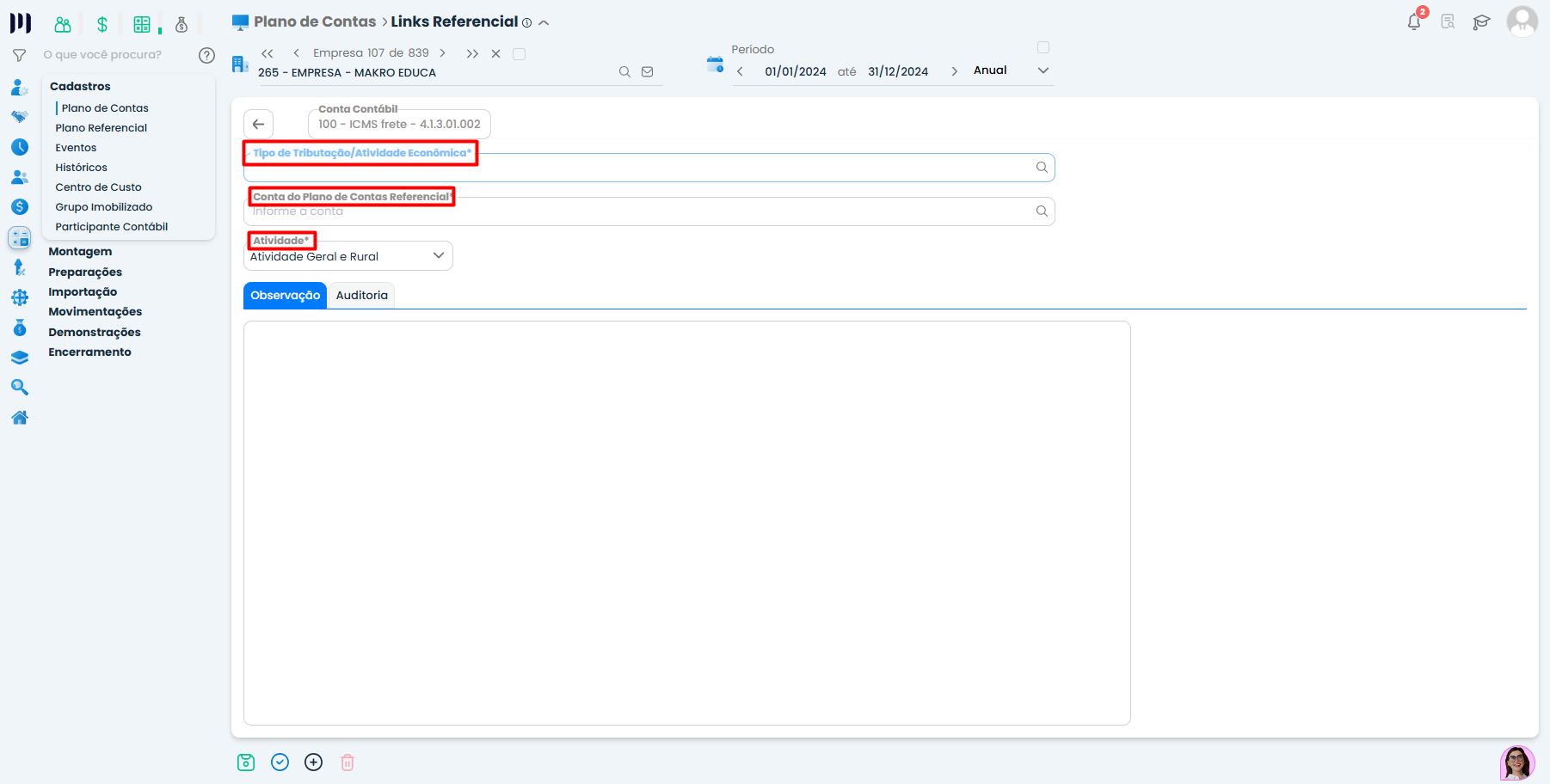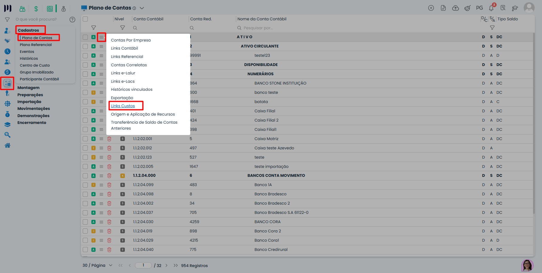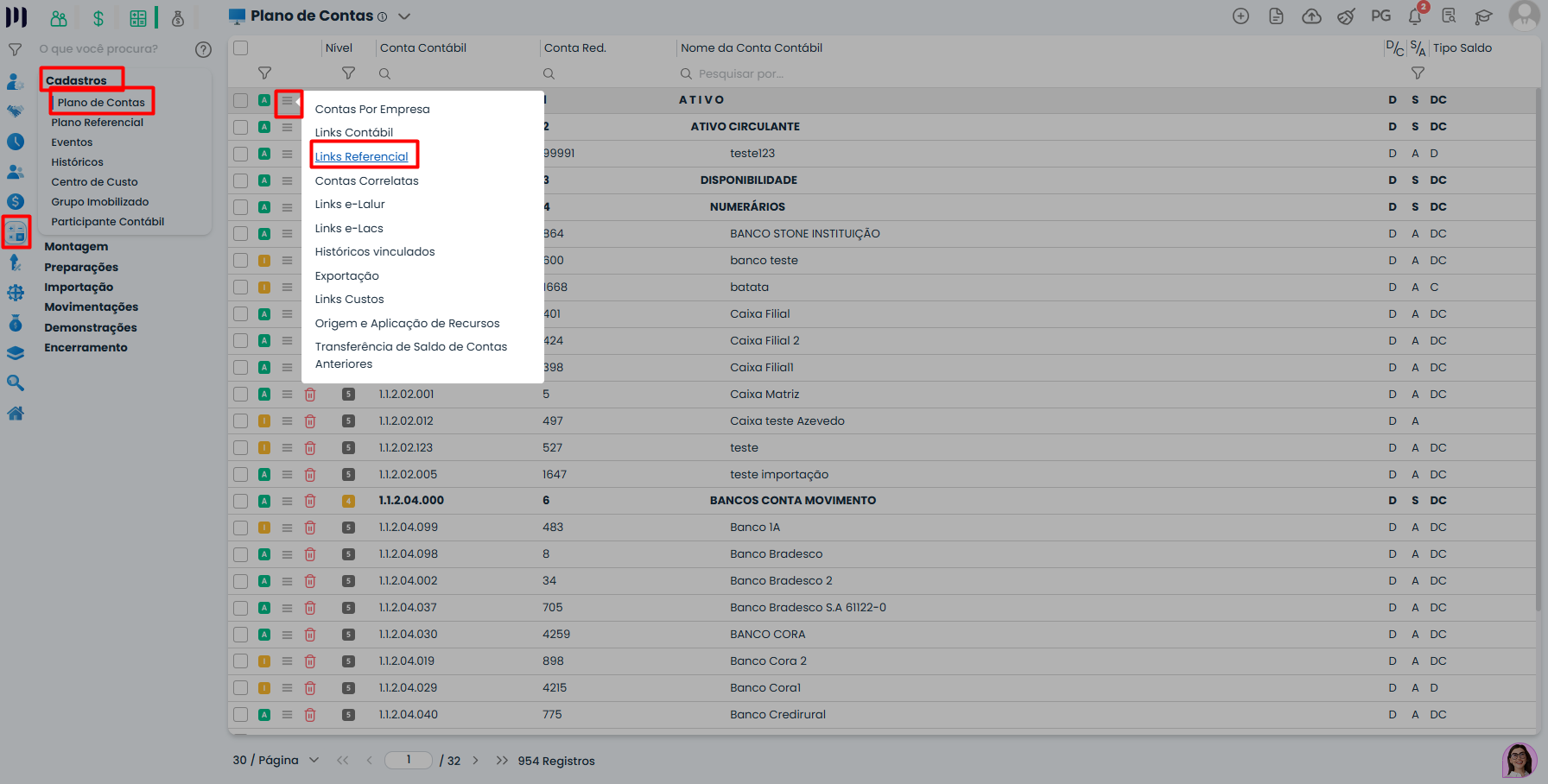 Realize a linkagem referencial de todas as contas contábeis utilizadas