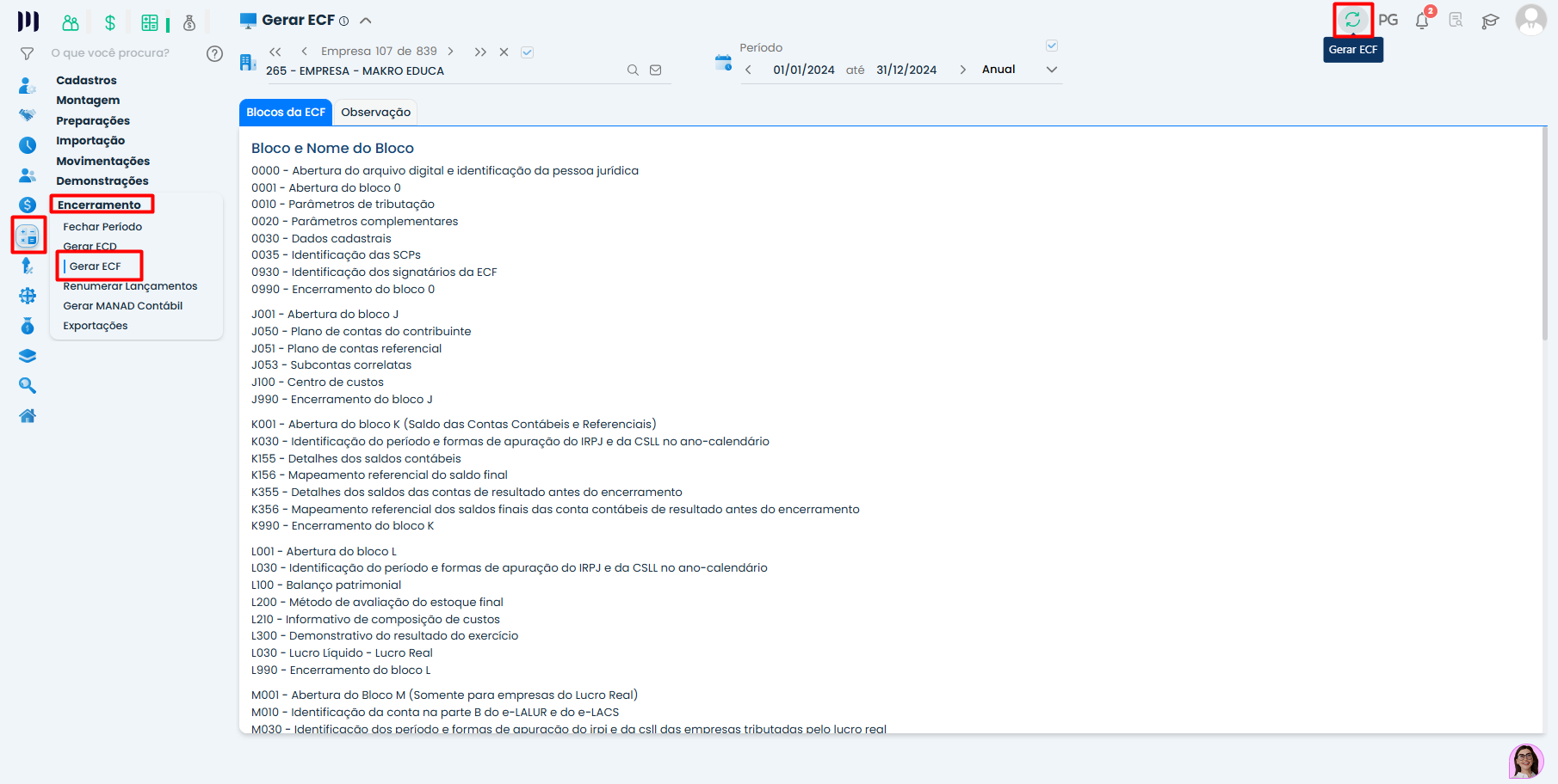Após todas as configurações, acesse: Contábil > Encerramento > Gerar ECF