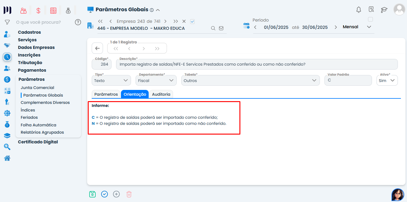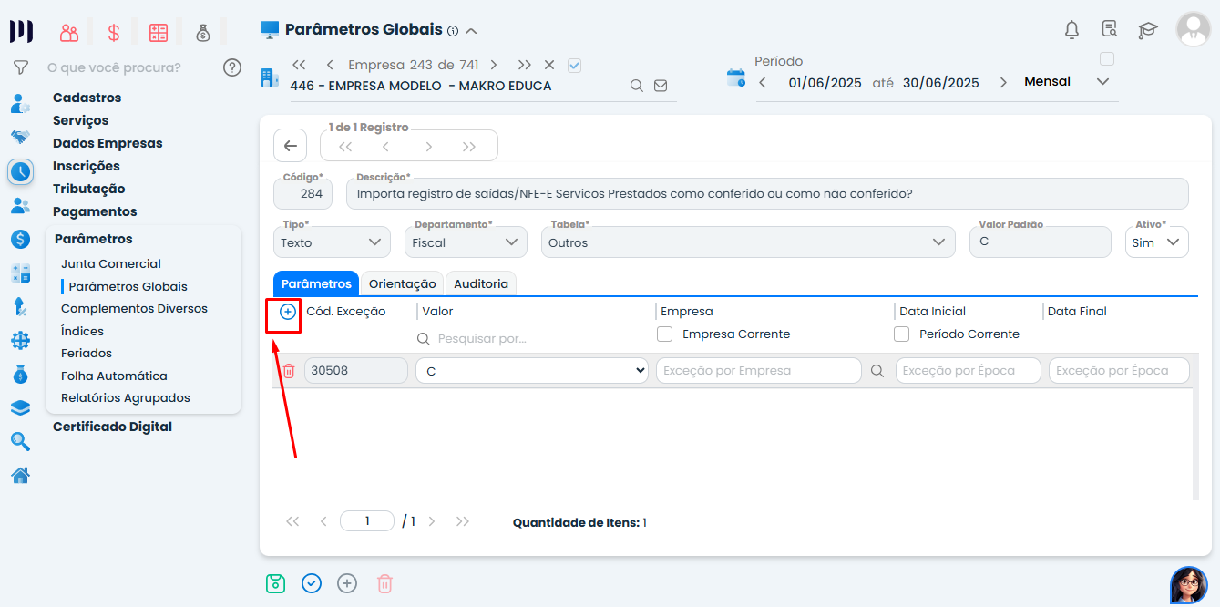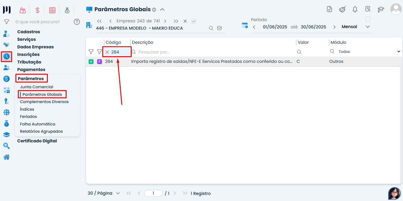 Acesse o menu: Preparar > Parâmetros > Parâmetros Globais. No campo “Código”, insira o número 284 e abra o parâmetro.