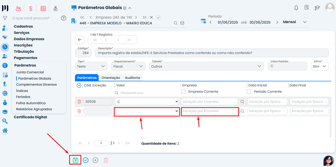 No campo “Valor”, insira a letra “C” para importar as notas fiscais como conferidas ou a letra “N” para importá-las como não conferidas. No campo “Empresa”, insira a razão social desejada e conclua a configuração clicando no botão “Salvar”.