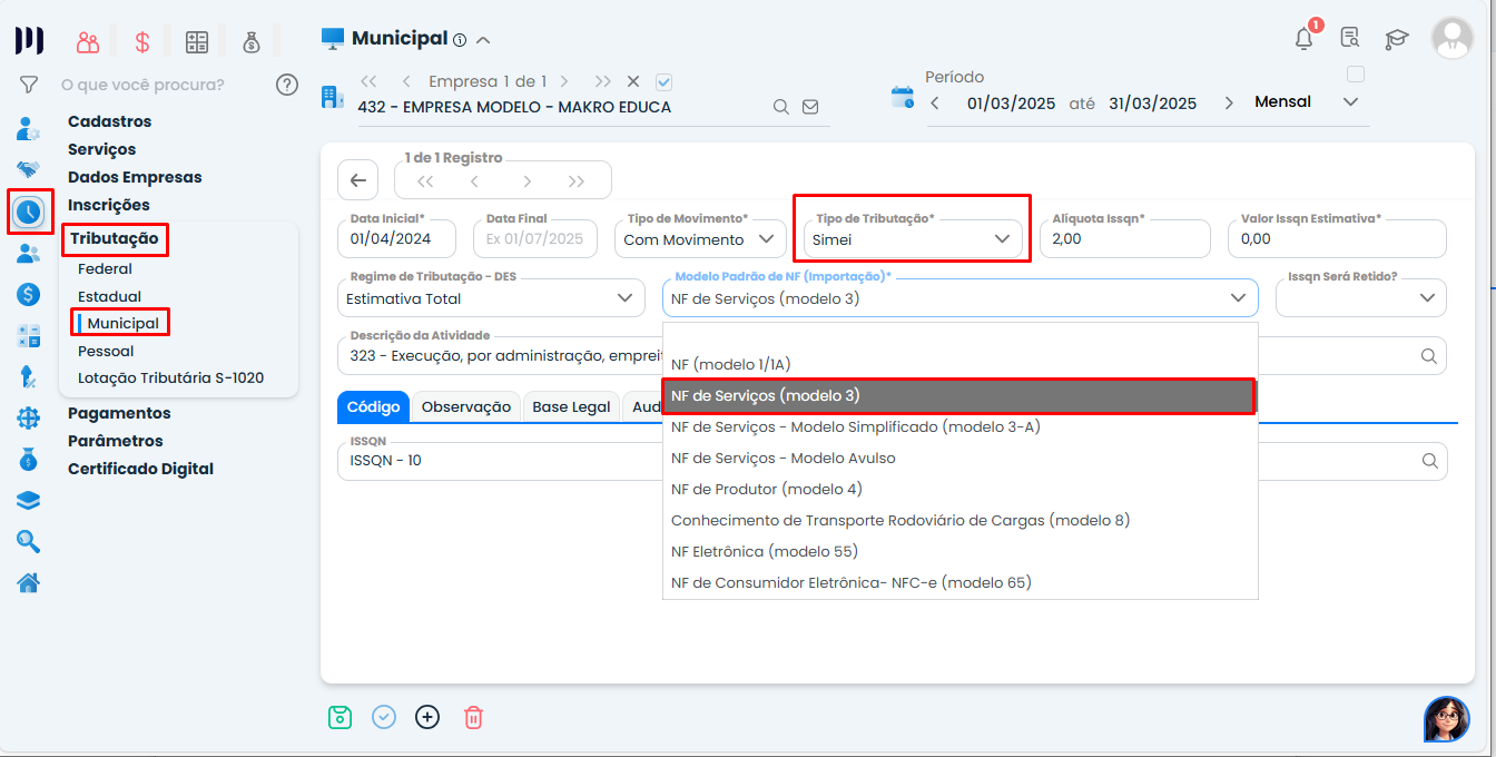 Para realizar a importação das Notas Fiscais de Serviço do seu cliente MEI, no cadastro da Tributação Municipal, deve estar configurado o Tipo de Tributação como Simei e o Modelo Padrão de NF (Importação), marcado a opção NF de Serviços (Modelo 3).