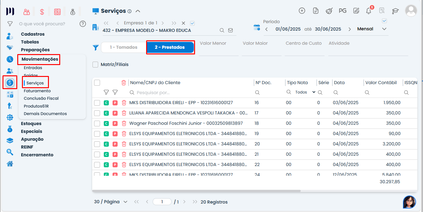 Fiscal > Movimentações > Serviços > Prestados