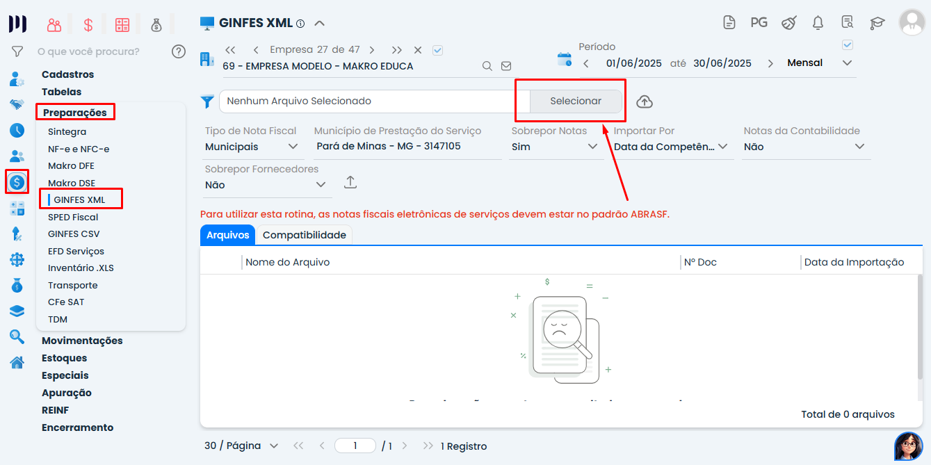 Acesse o módulo Fiscal > Preparações > GINFES XML. Clique em “Selecionar” e localize o arquivo XML correspondente às Notas Fiscais de Serviços.