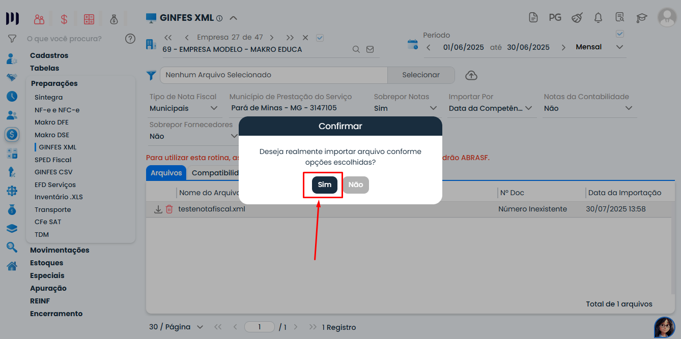 Antes de concluir o procedimento, o sistema apresentará uma mensagem de confirmação, solicitando a validação da importação conforme as opções previamente selecionadas. Para prosseguir com a operação, é necessário confirmar clicando na opção “Sim”.