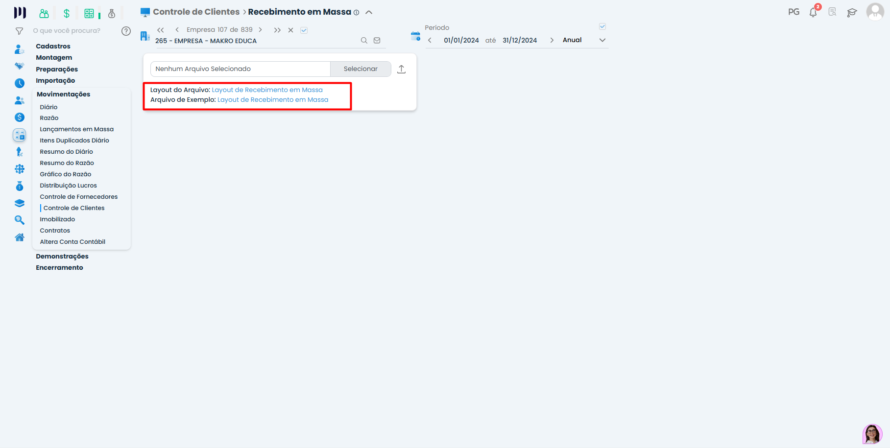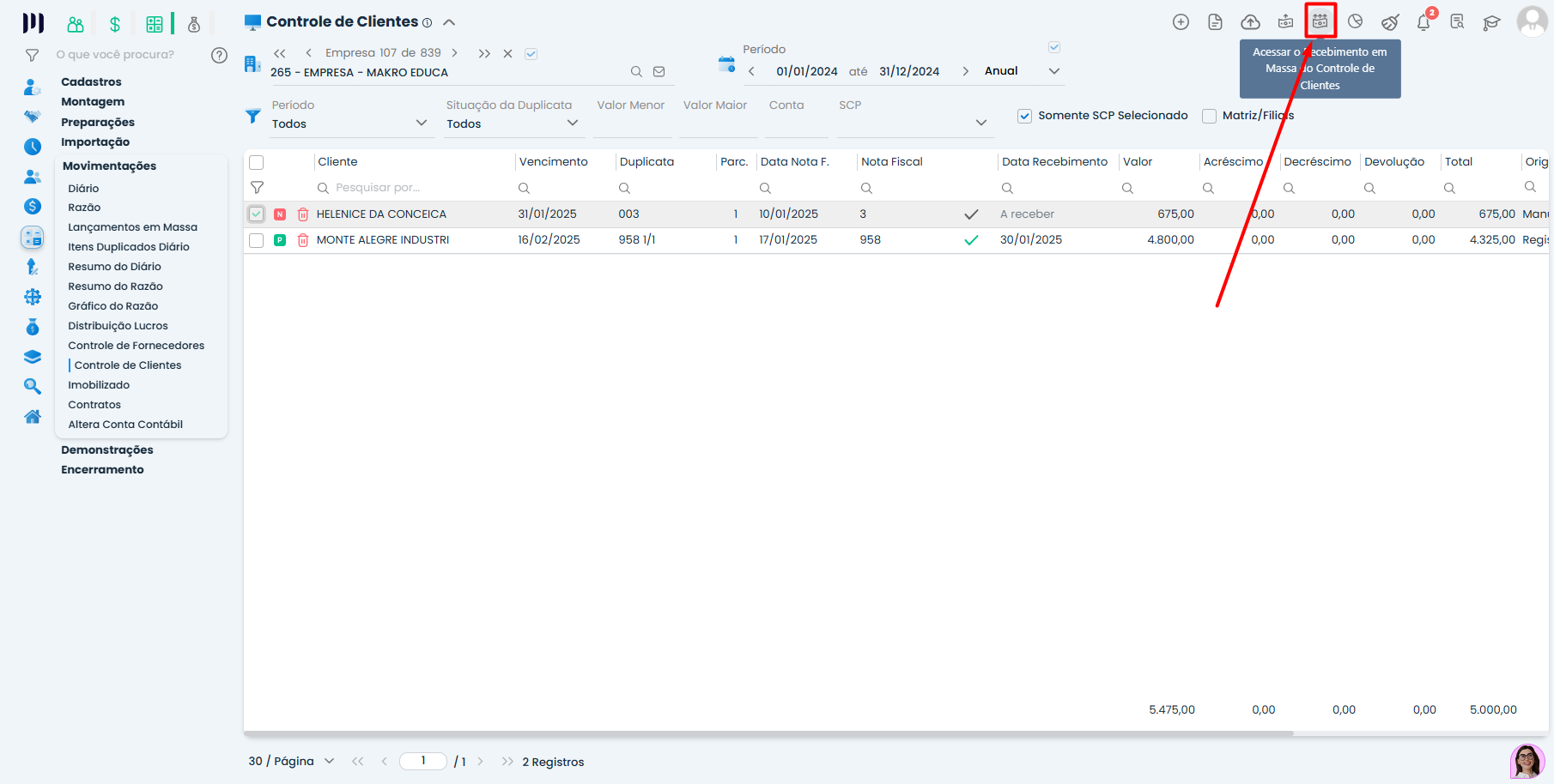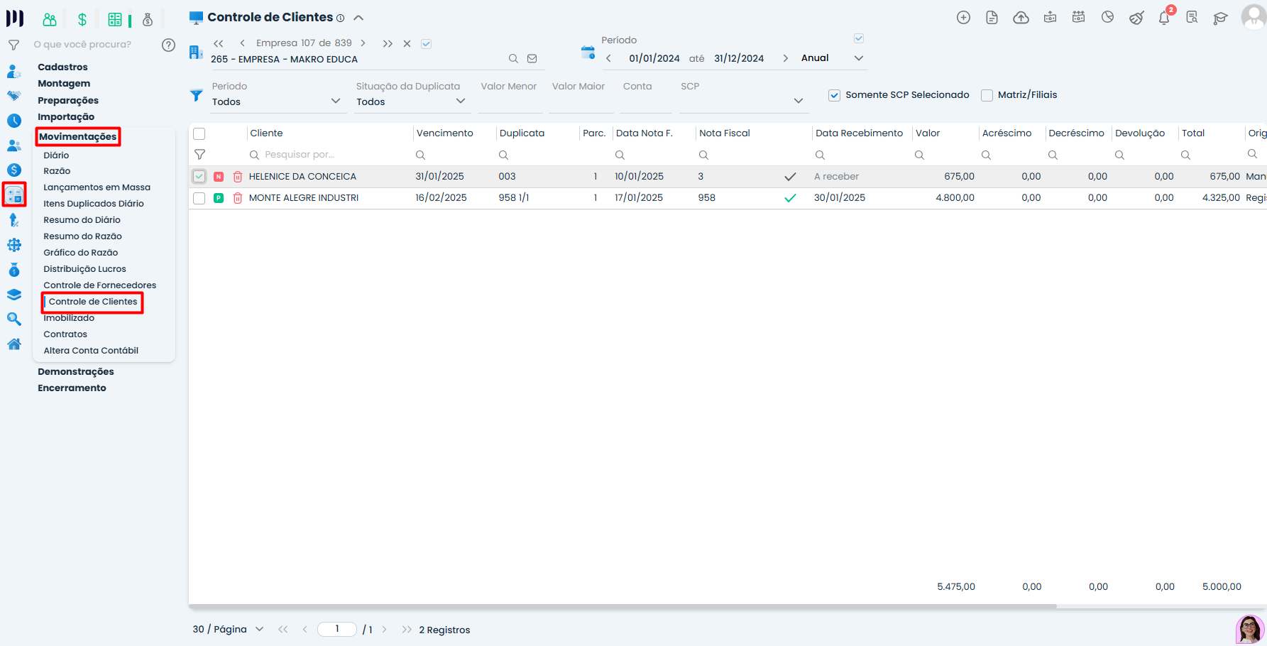 Navegue até: Contábil > Movimentações > Controle de Clientes