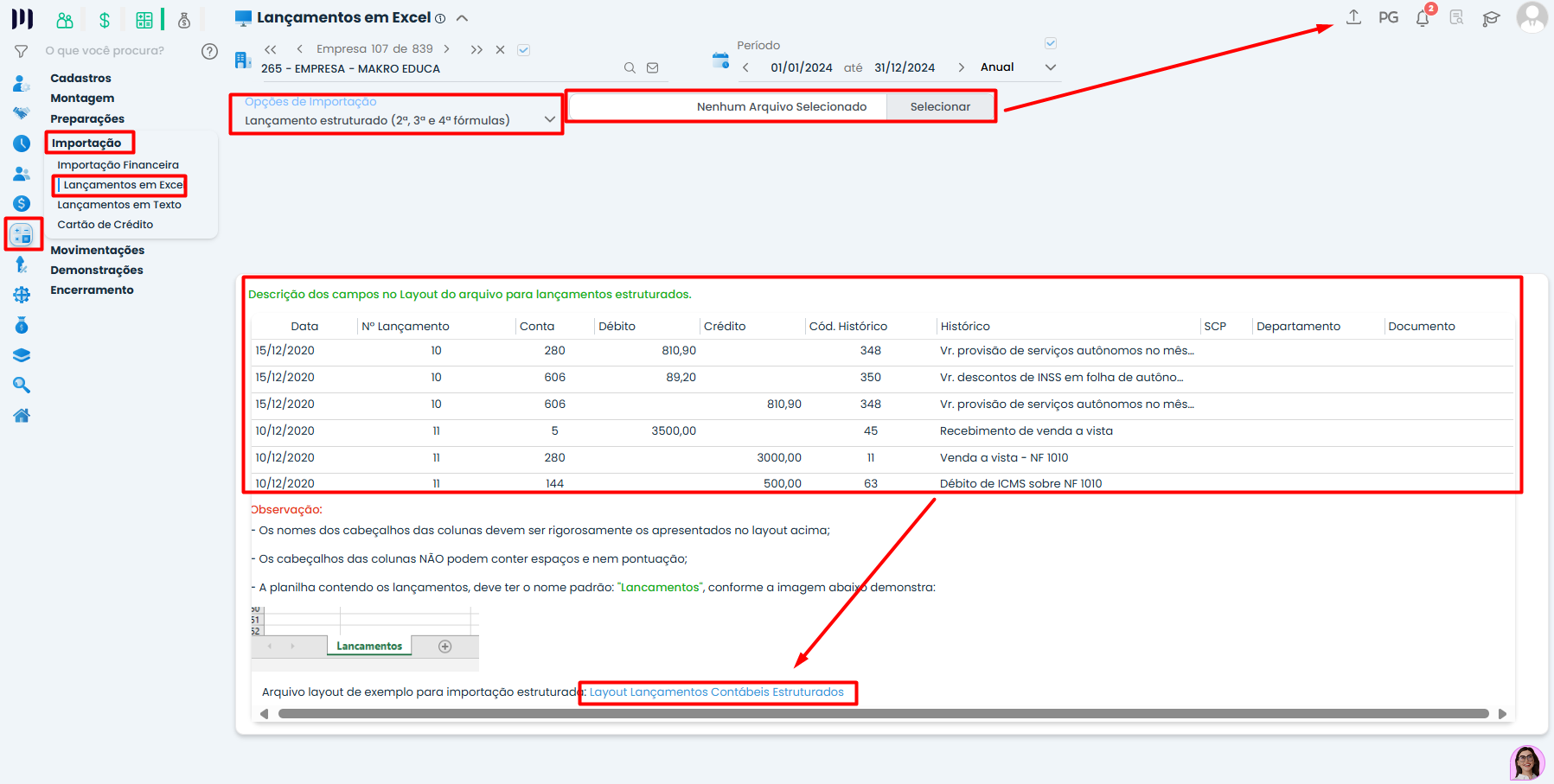 importação excel, lançamentos estruturados, fórmulas contábeis, importação em lote, planilha modelo makro, lançamentos múltiplos, contabilidade automatizada