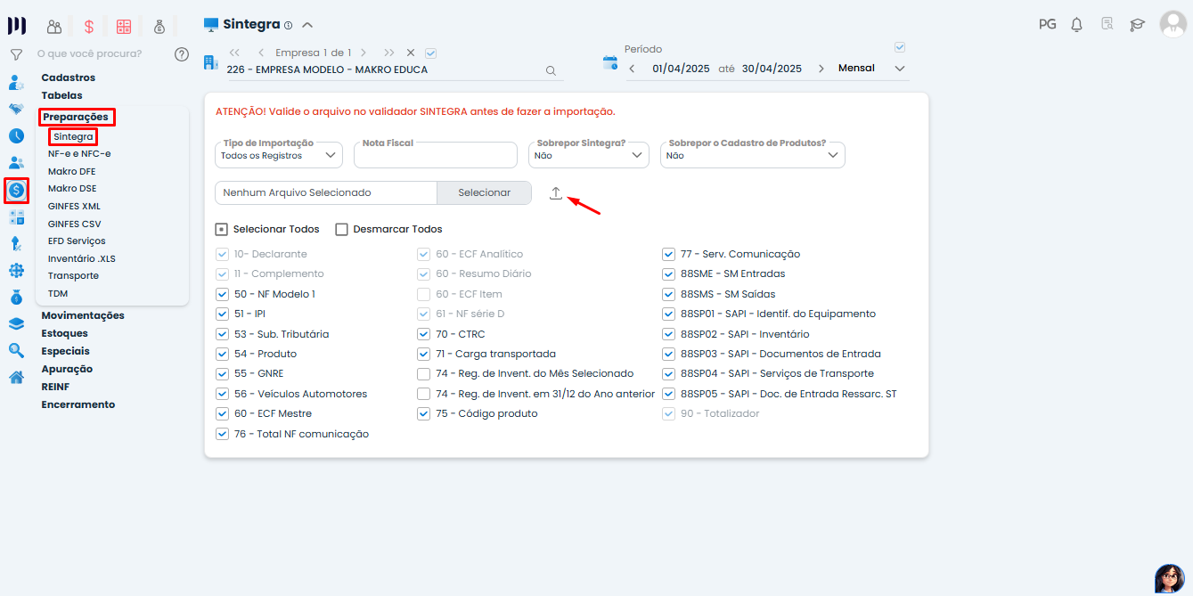 O sistema permite importar notas fiscais através do arquivo SINTEGRA, facilitando sua rotina fiscal. Vamos aprender como fazer isso passo a passo!