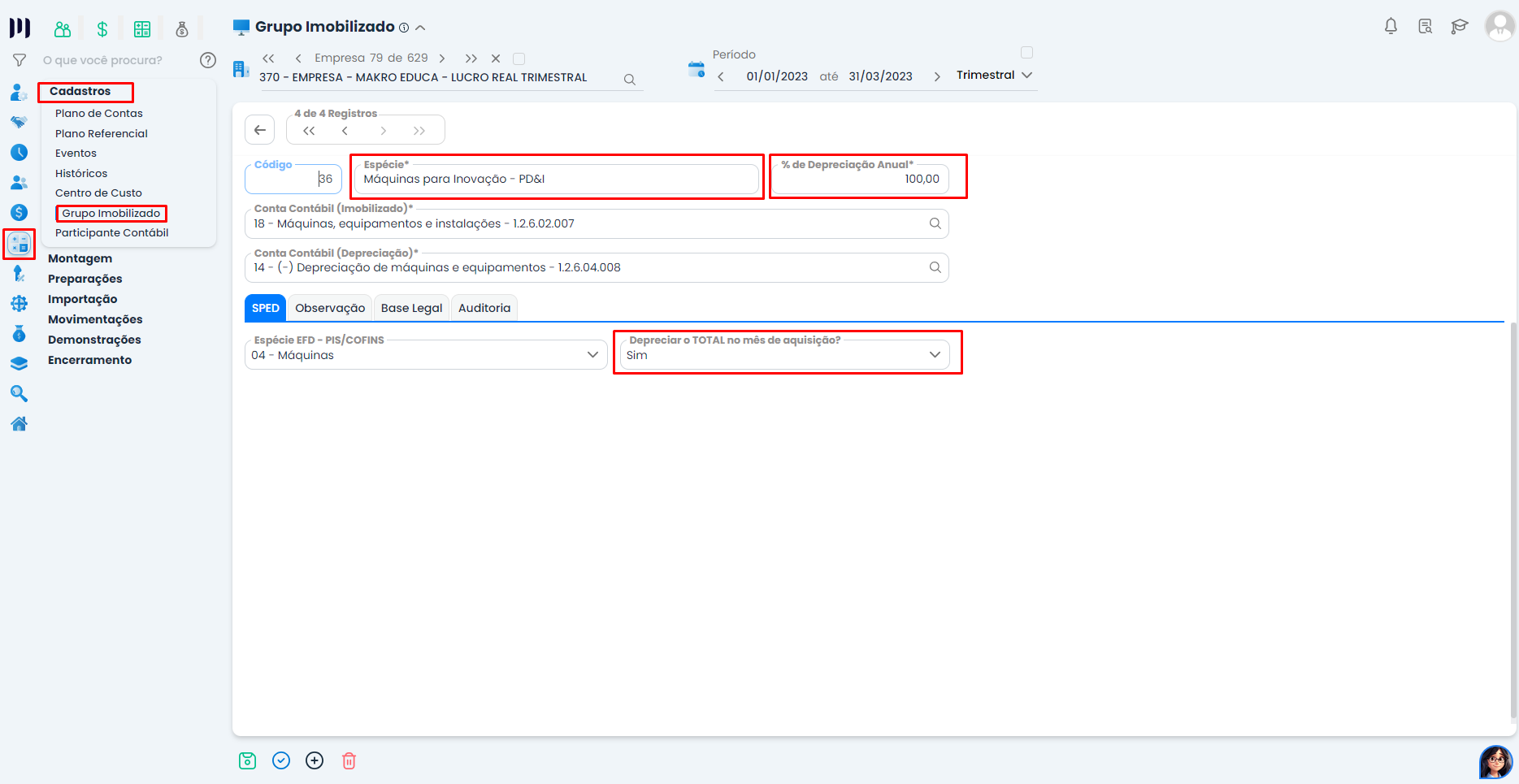 • Confirme se o campo no SPED está como SIM para depreciação integral
