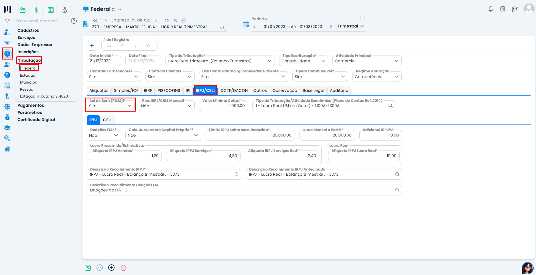 • Localize o campo: “Lei do Bem (PD&I)?”