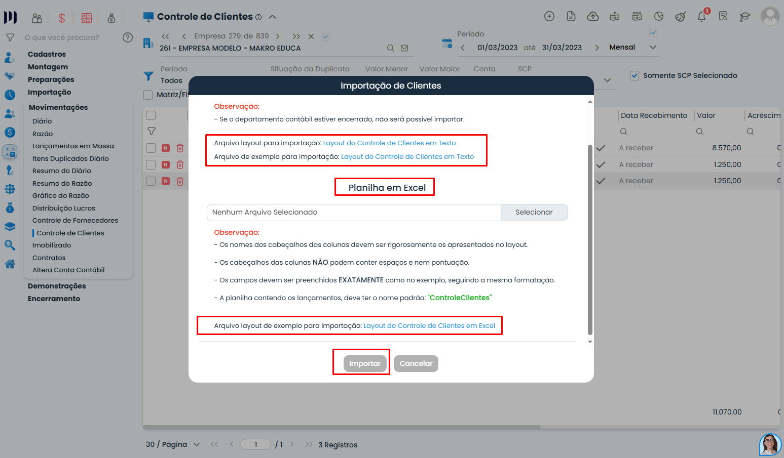 As duas primeiras opções de importação serão realizadas pelo controle de clientes, enquanto a última será executada pelo diário.