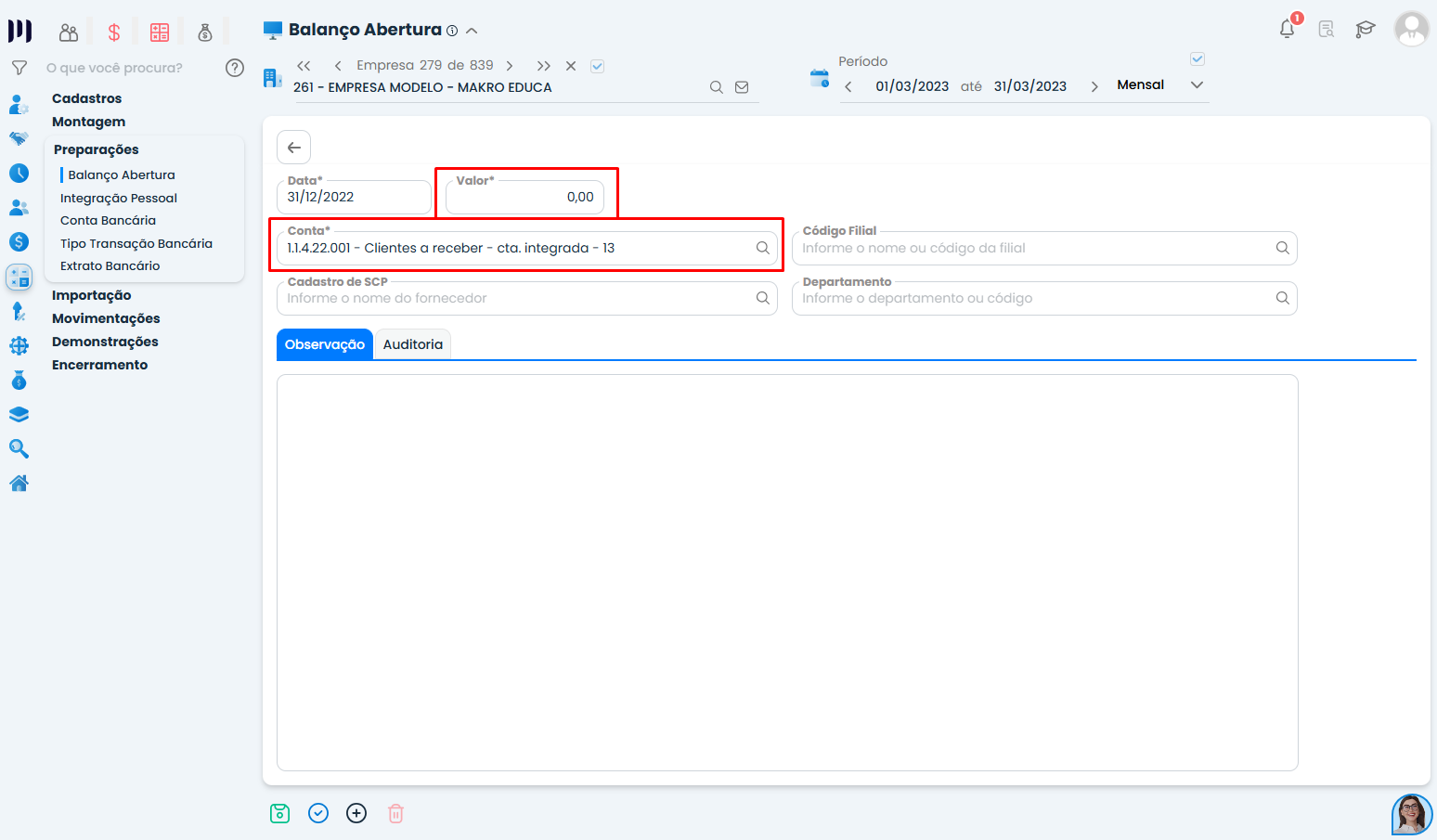 • Insira o saldo correspondente e a conta contábil de Clientes a Receber