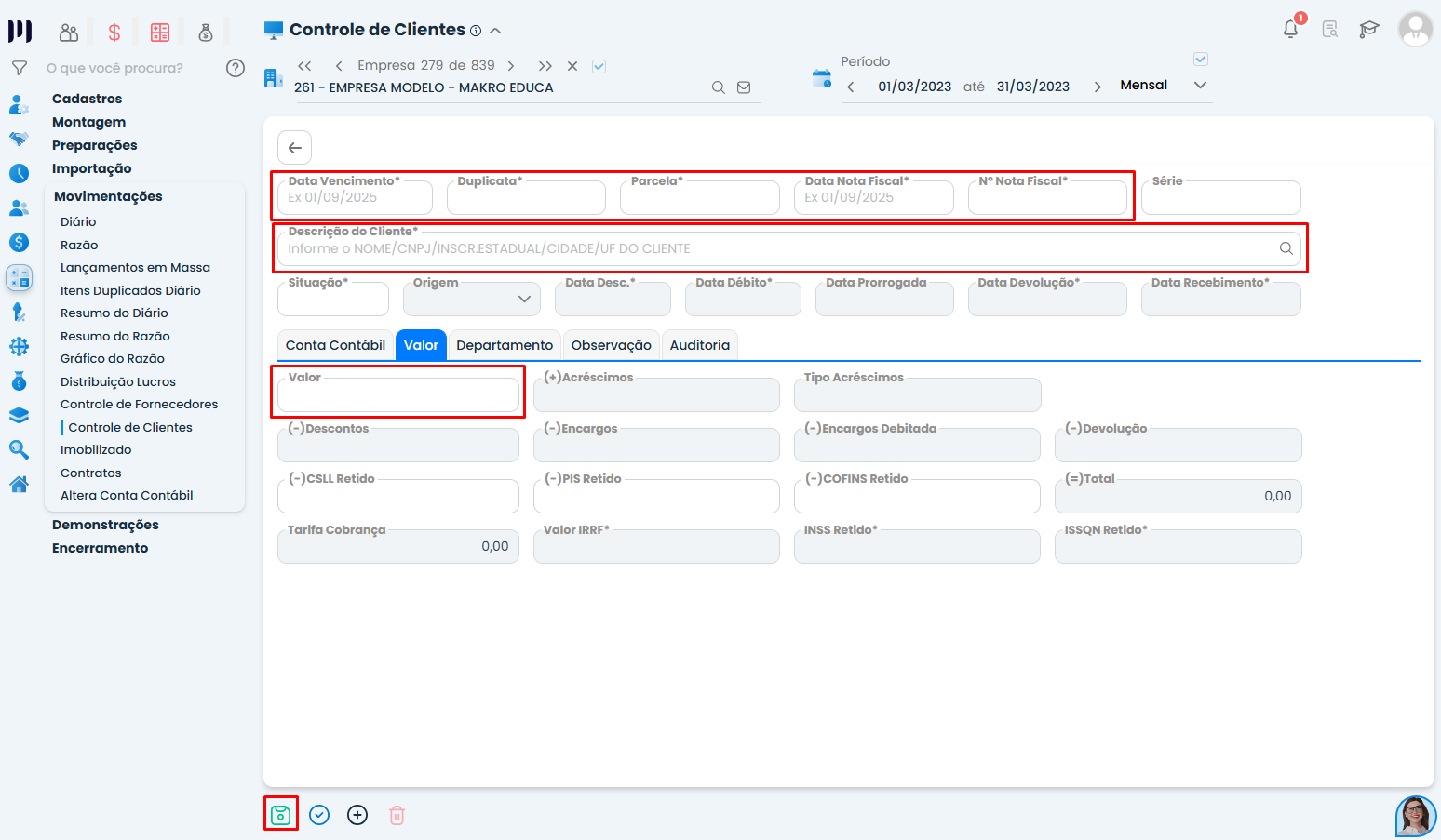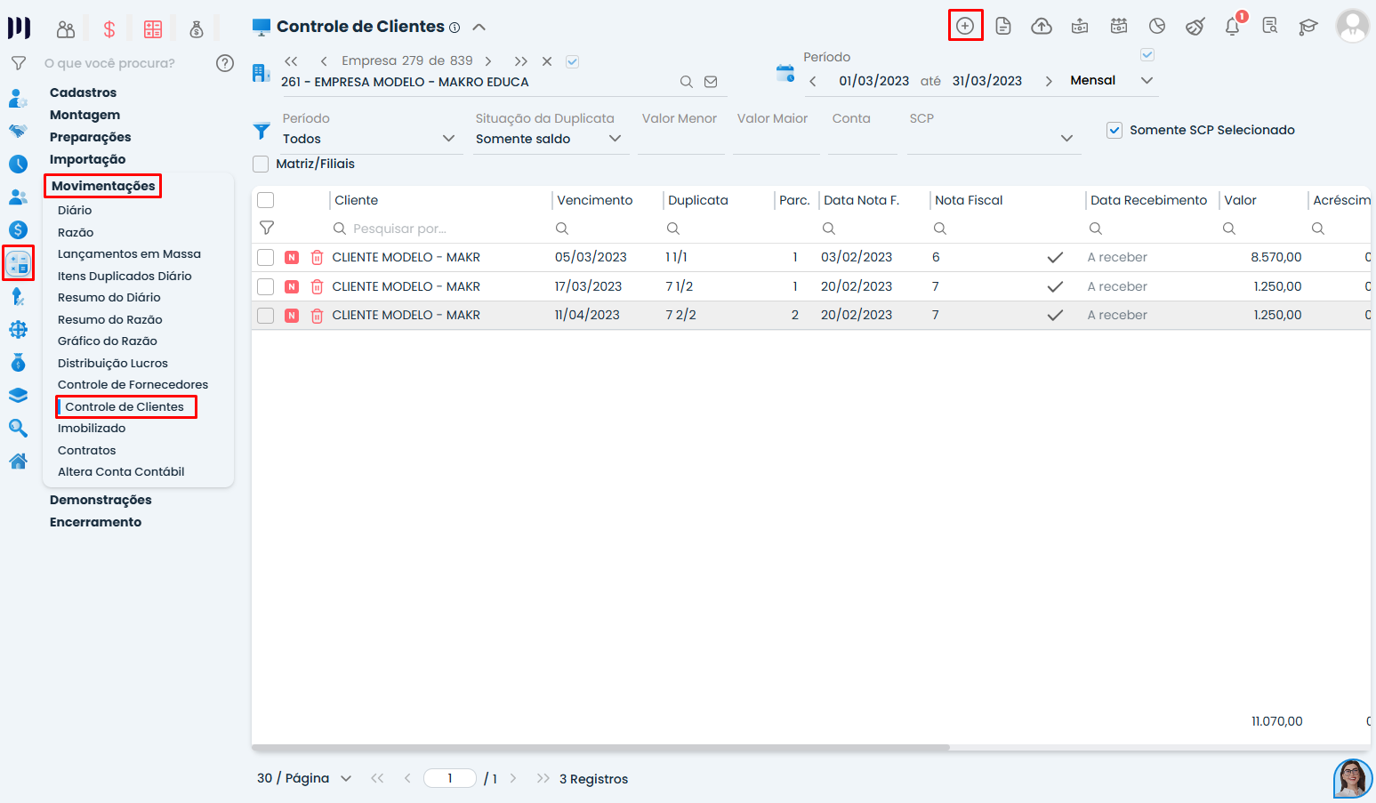 • Acesse o módulo Contábil > Movimentações > Controle de Clientes