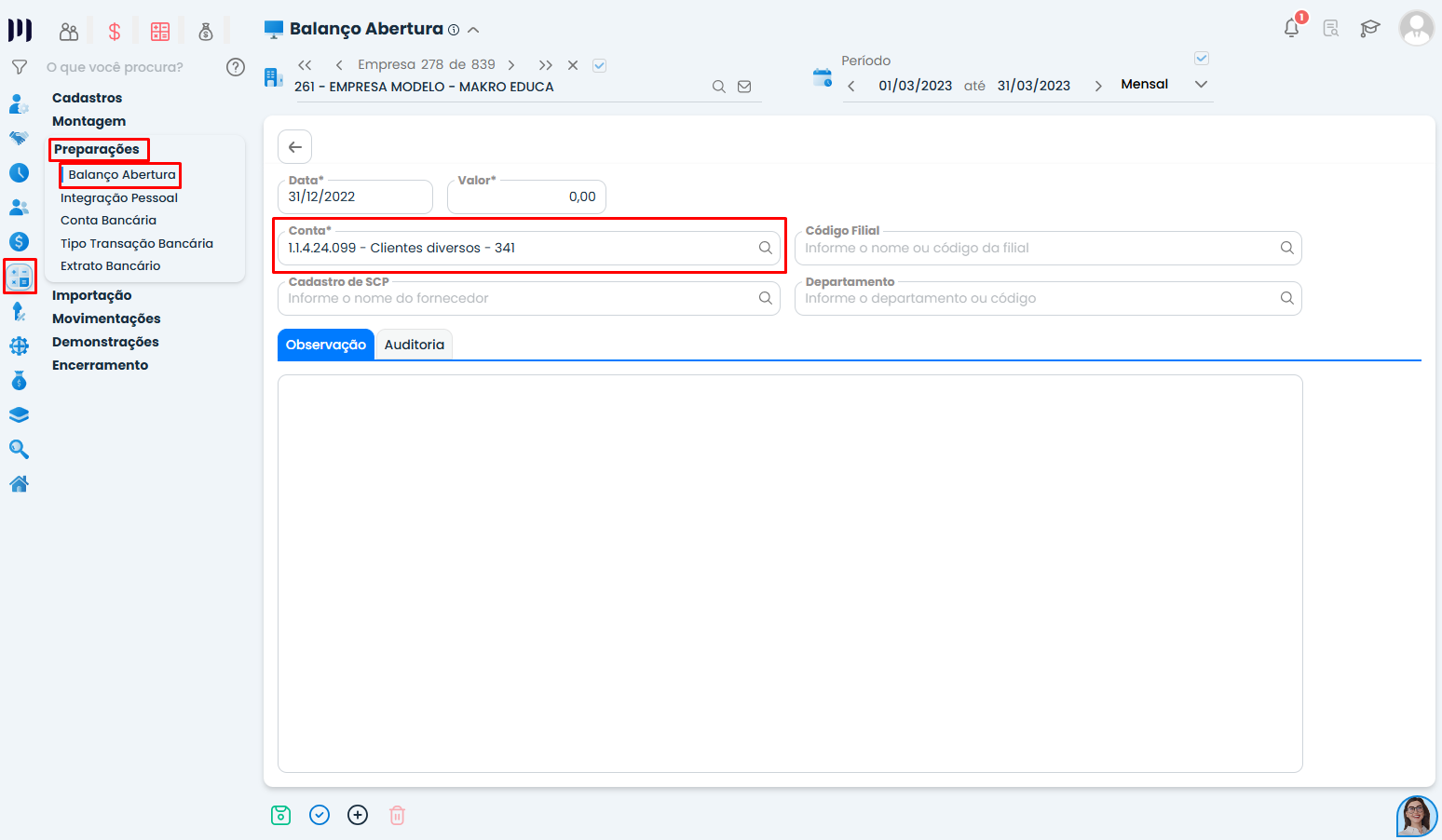 • Acesse novamente o Contábil > Preparações > Balanço de Abertura > Informar o valor e utilizar a conta de Clientes Diversos