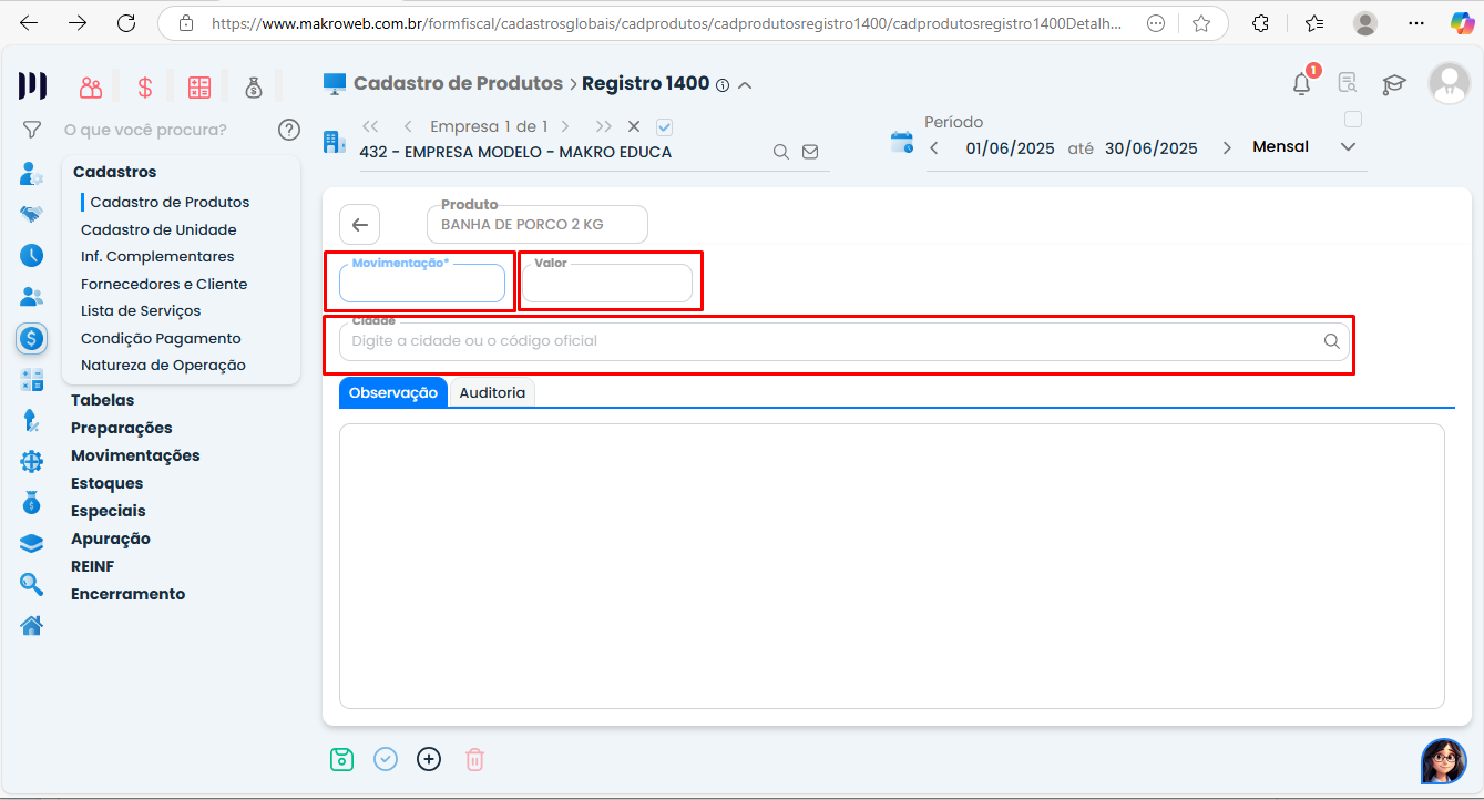 Após abrir o produto clicar no subnivel (tres risquinhos) > Registro 1400 > Incluir