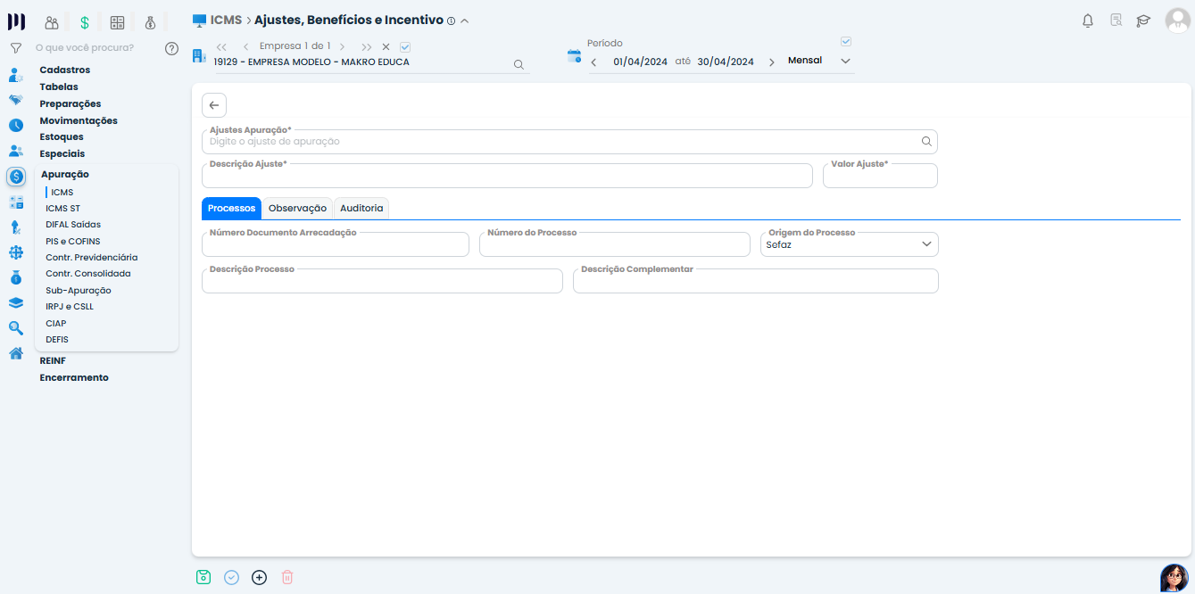 Ajuste Apuração: Selecione o tipo de ajuste conforme a UF do contribuinte