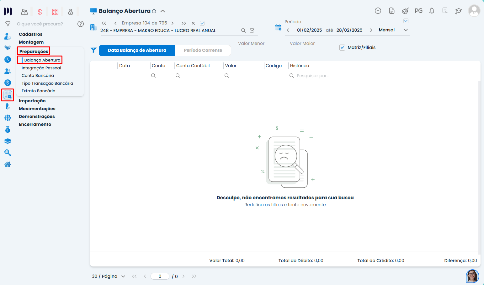 Contábil > Preparações > Balanço Abertura (valores totais)