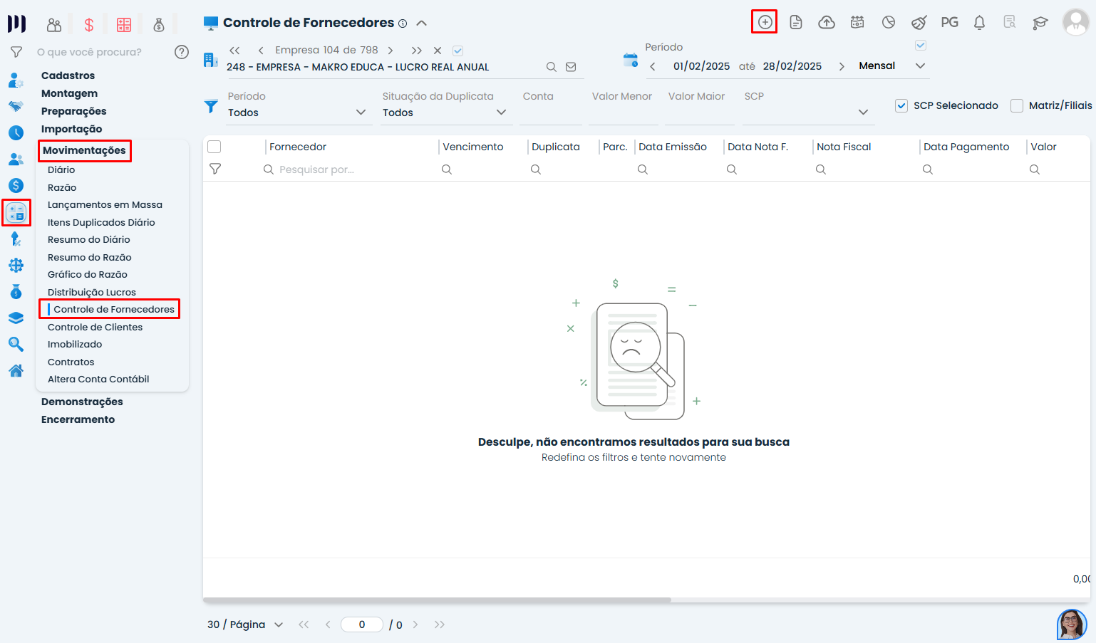Fornecedores: Contábil > Movimentações > Controle de Fornecedores > Incluir