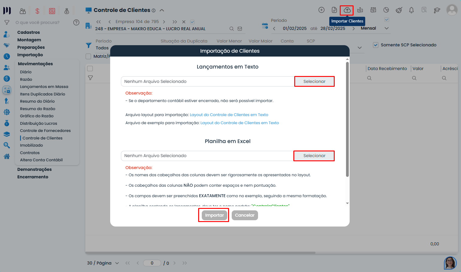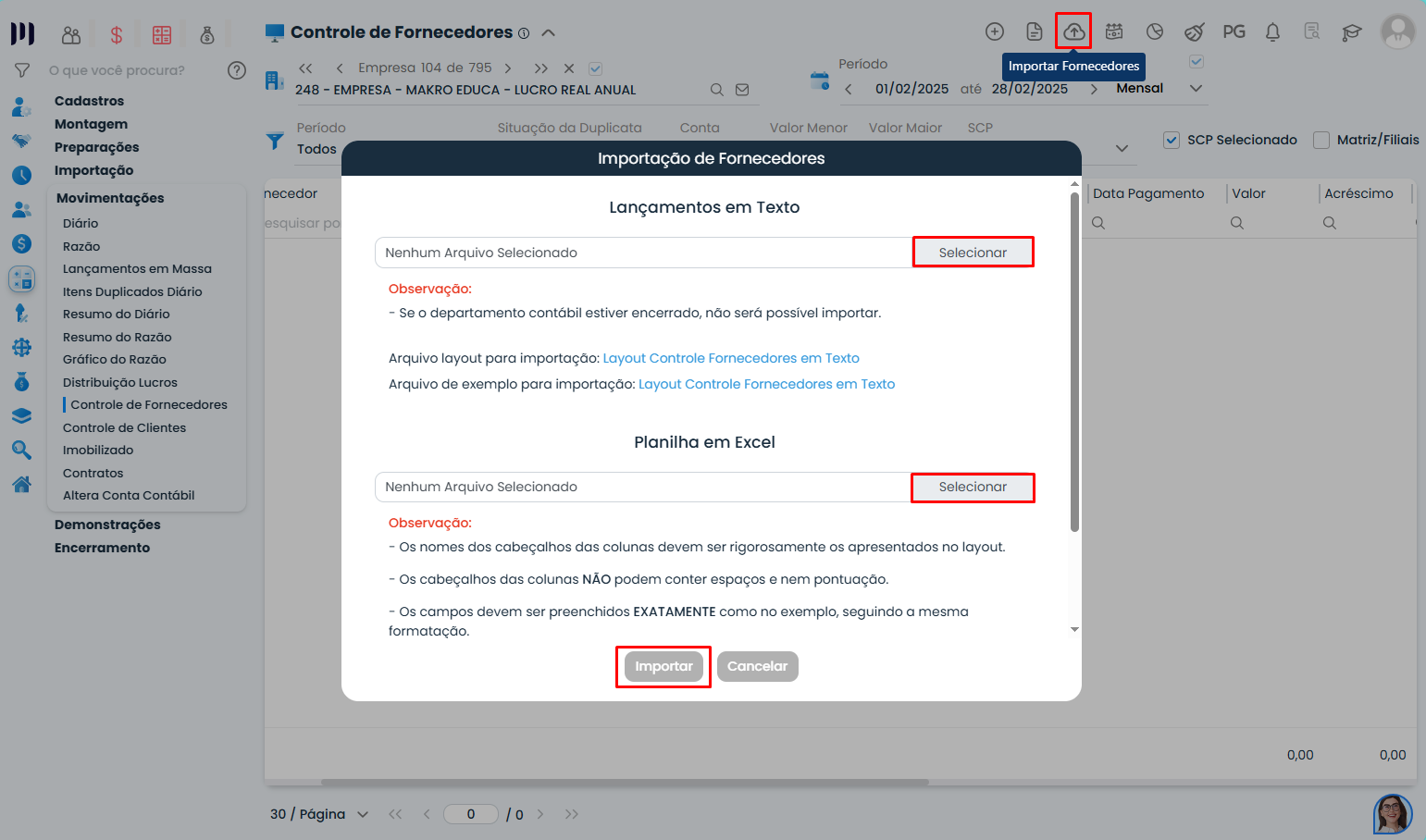 Opção alternativa: importe via Importar (arquivos TXT ou Excel)
