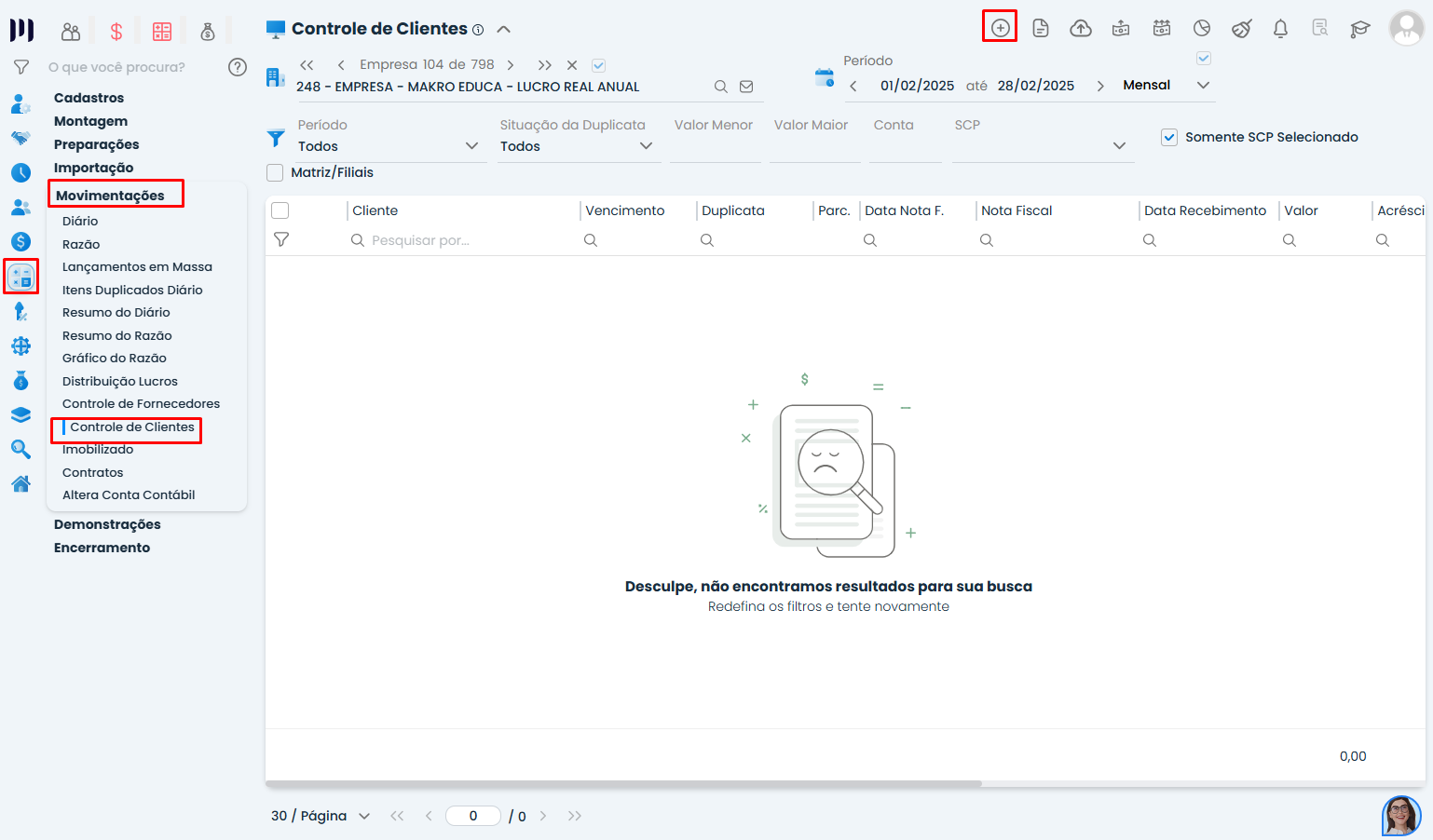 Clientes: Contábil > Movimentações > Controle de Clientes > Incluir