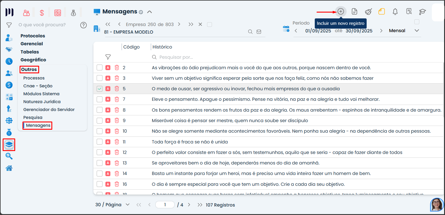 • Se quiser criar uma nova mensagem, clique em “Incluir novo registro”.