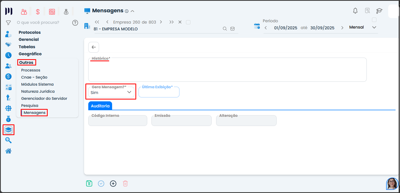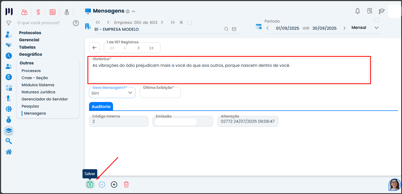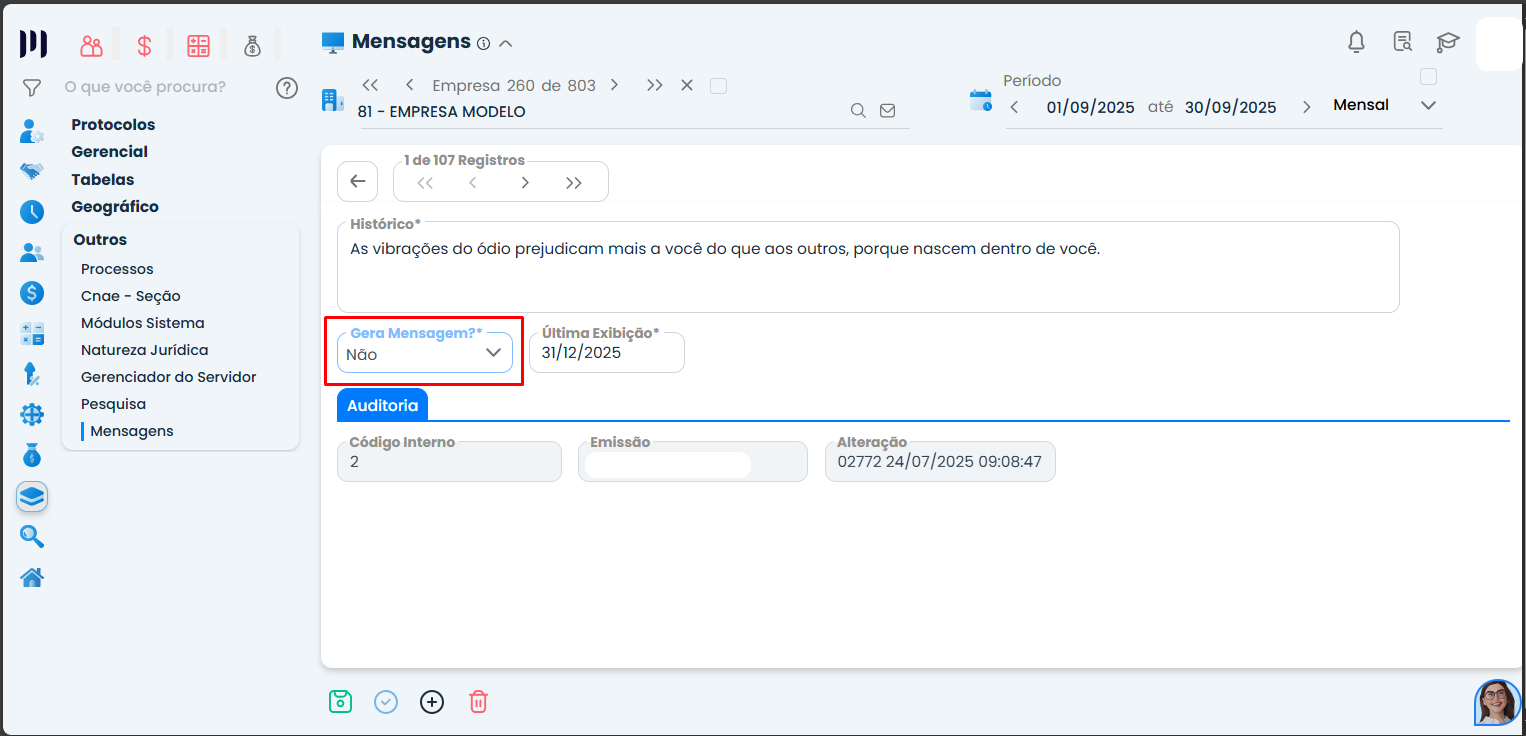 • No campo “Gera Mensagem?”, altere a opção para “NÃO”. Depois clique em ‘Salvar’.