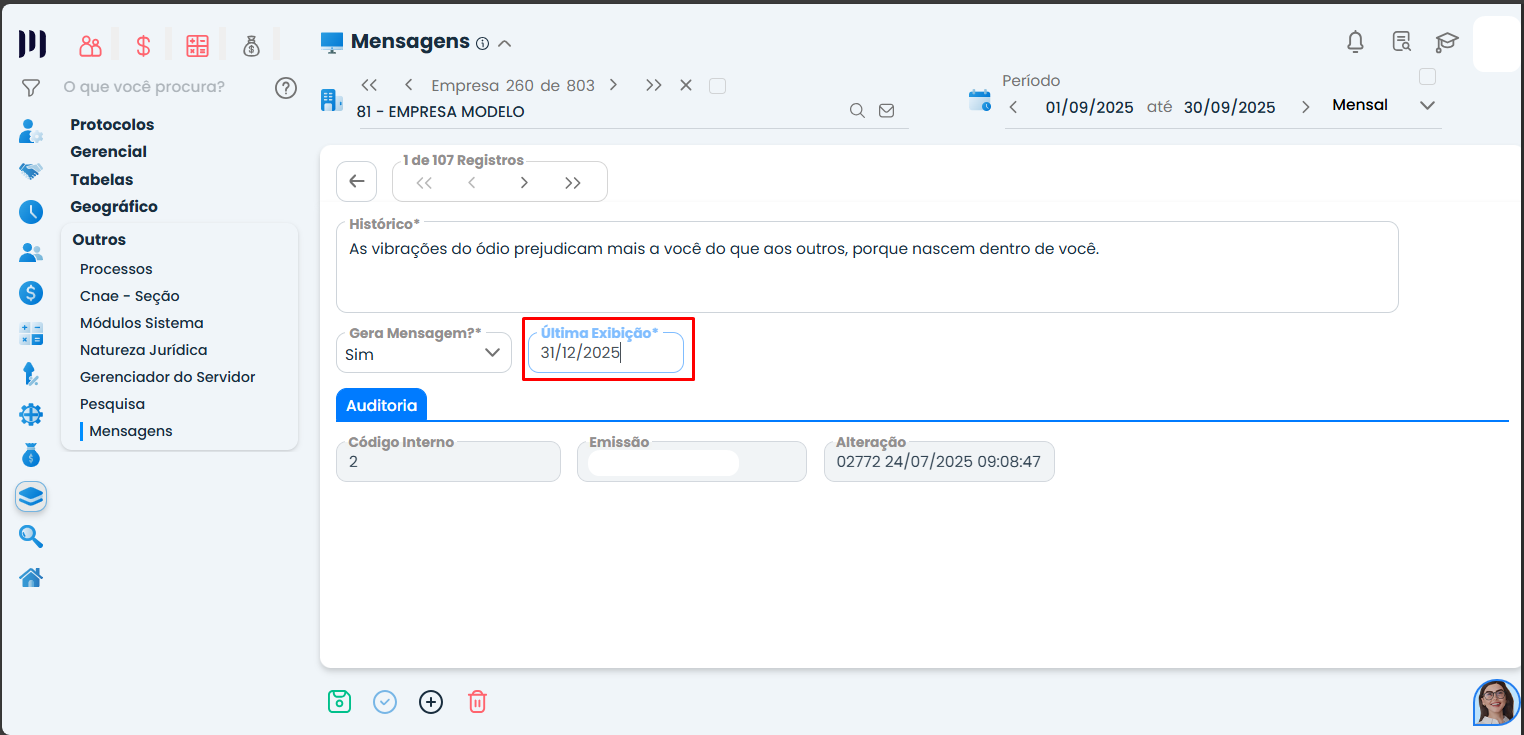 Passo 3: No campo “Última exibição”, você pode escolher até qual data a mensagem deve continuar aparecendo no recibo de pagamento;