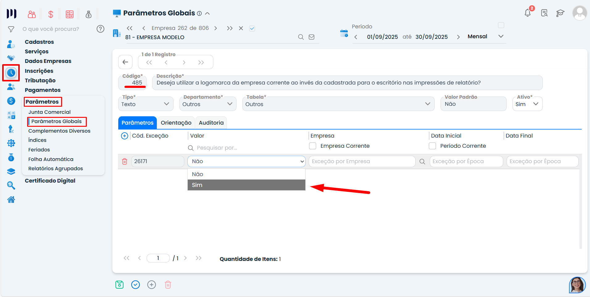 Passo 6: Clique no registro encontrado e, no campo “Ativo”, selecione a opção Sim. Isso ativará o uso da logomarca da empresa nos relatórios.