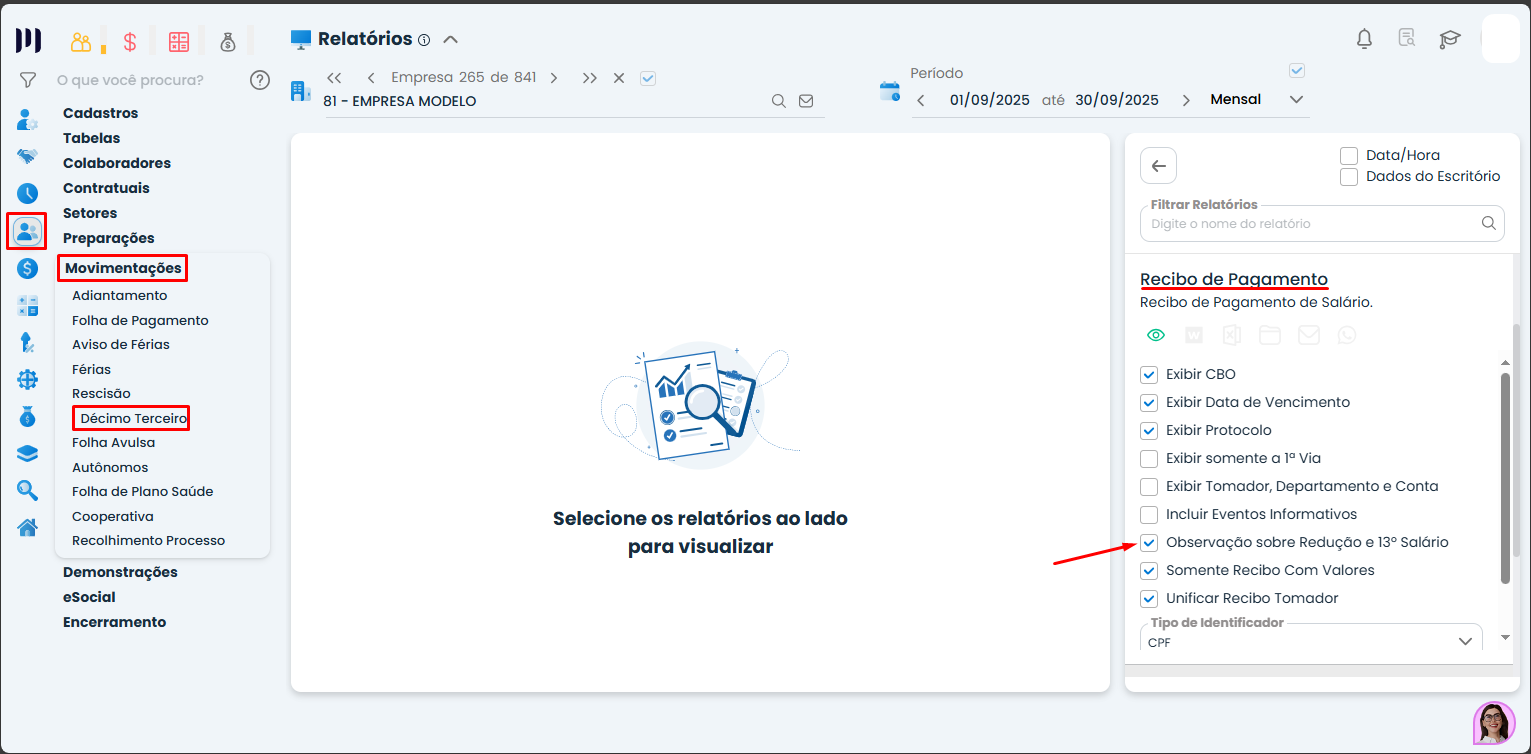 Se você precisa que o recibo do 13º salário traga a observação sobre Redução de Jornada ou Salário, é necessário ativar essa opção antes da geração.