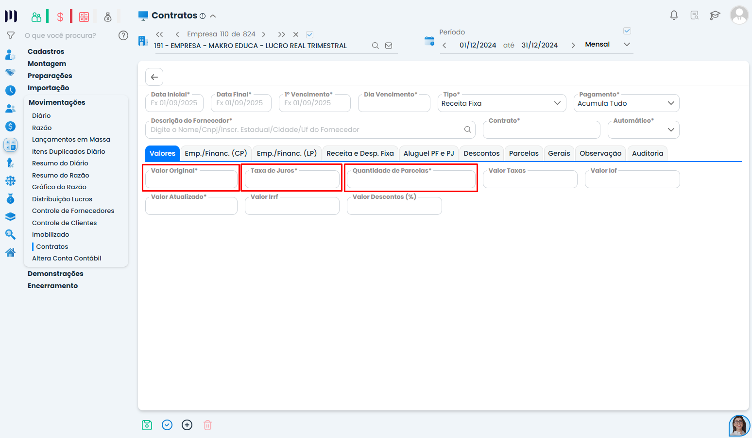 • Observação: As parcelas serão calculadas automaticamente conforme os valores informados.