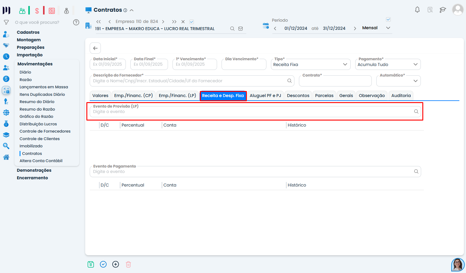 • Em “Receita e Desp. Fixa”, informe o evento contábil responsável pelo lançamento.