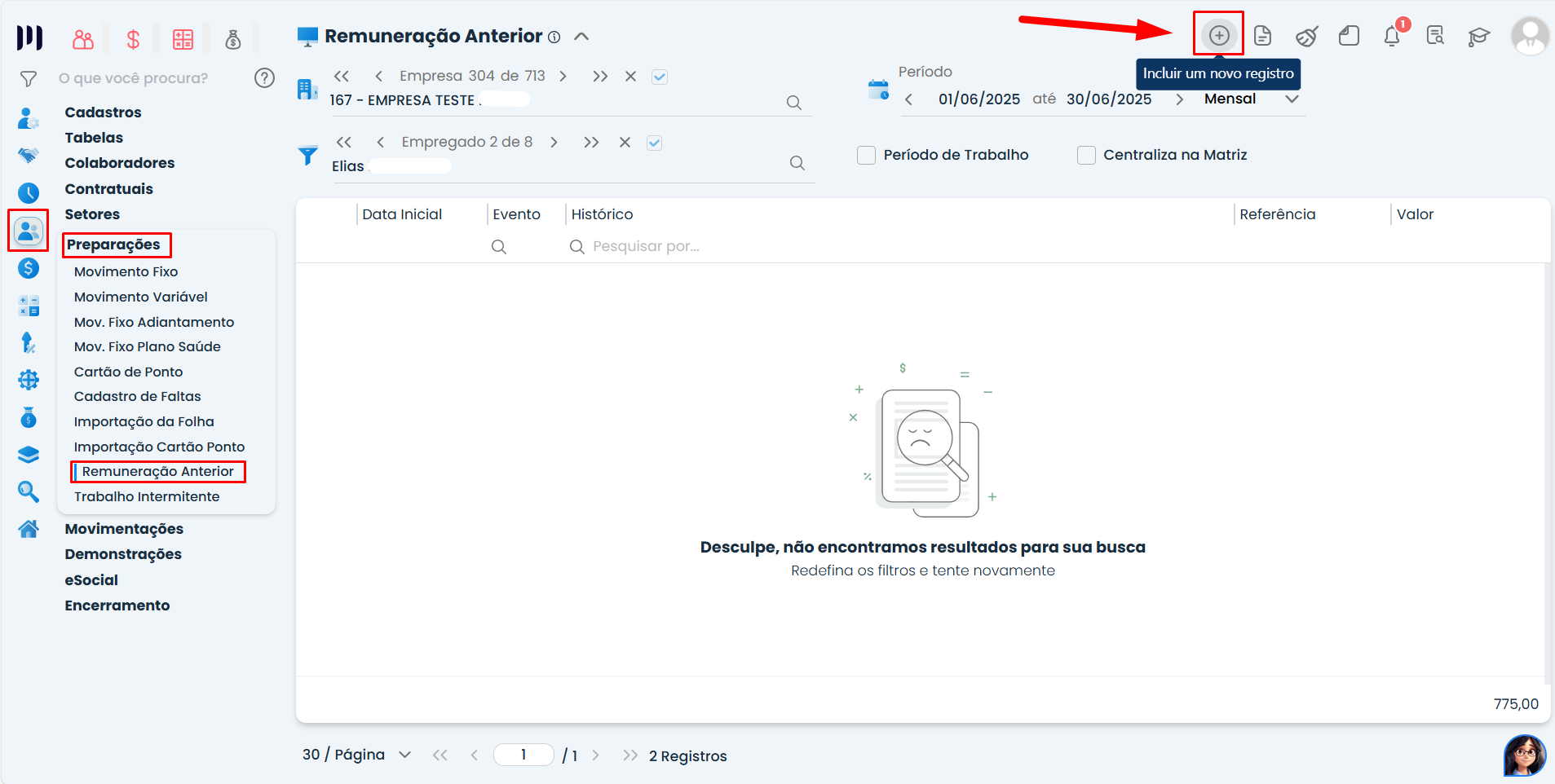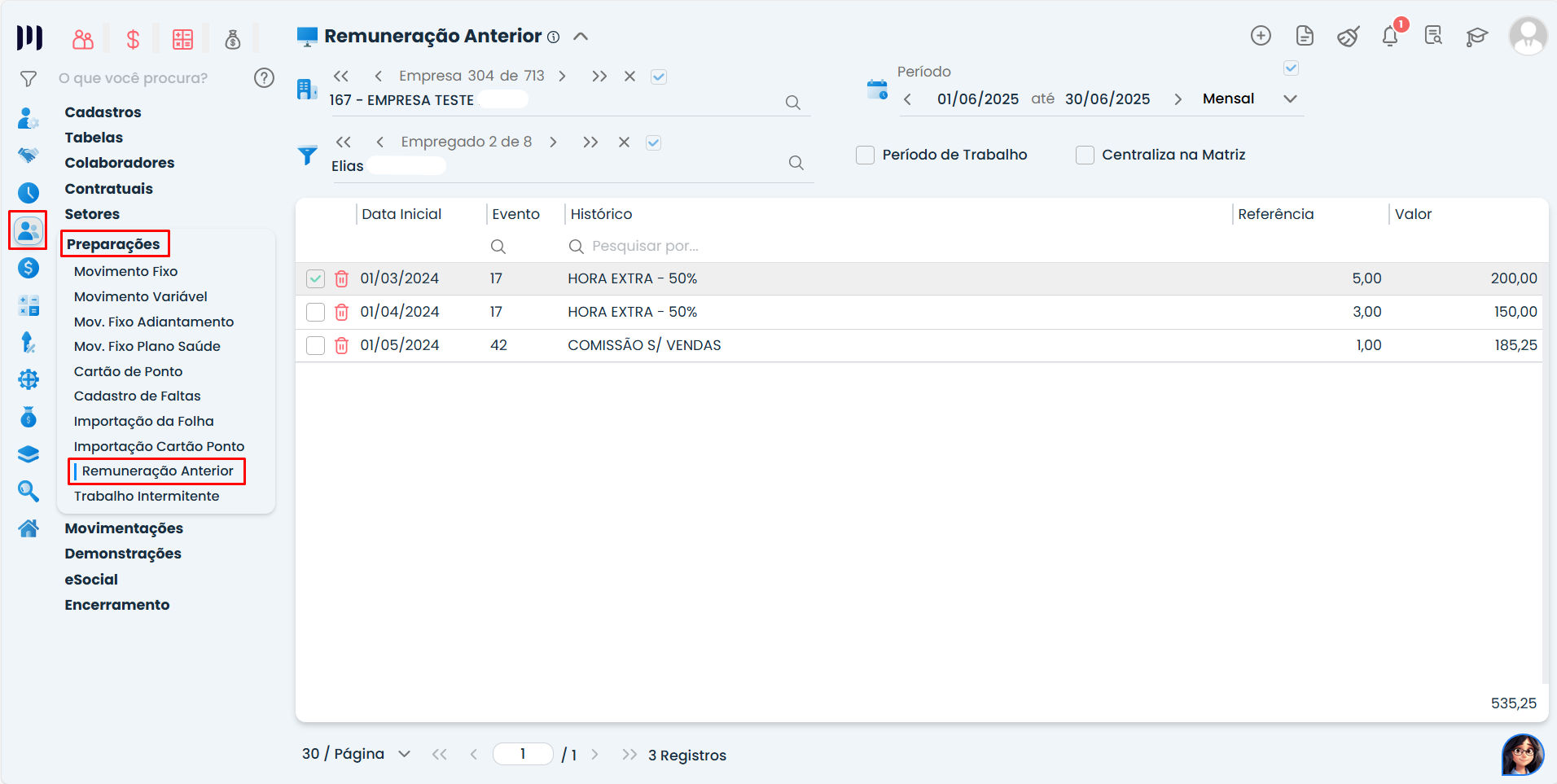 Passo 2: Clique em Preparações e depois em Remuneração Anterior.