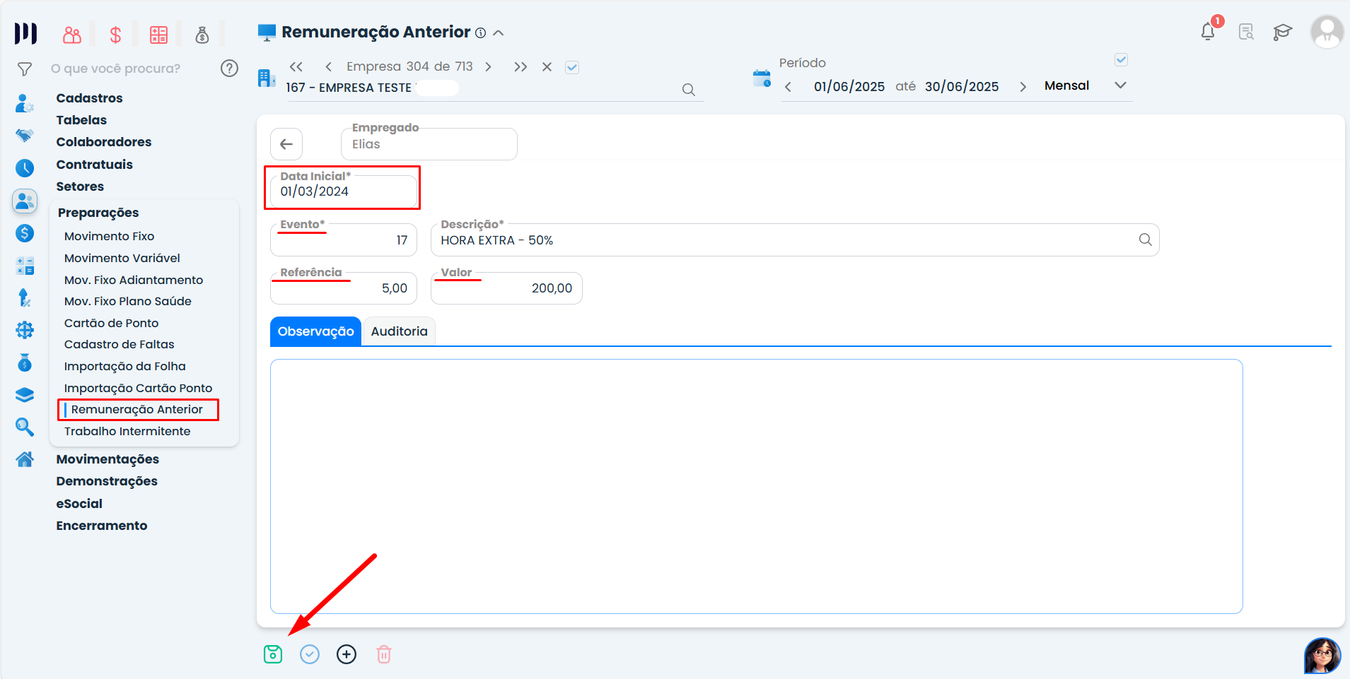 Passo 3: Lance os eventos necessários (ex.: salário, horas extras) com data inicial correspondente ao mês de referência da remuneração.