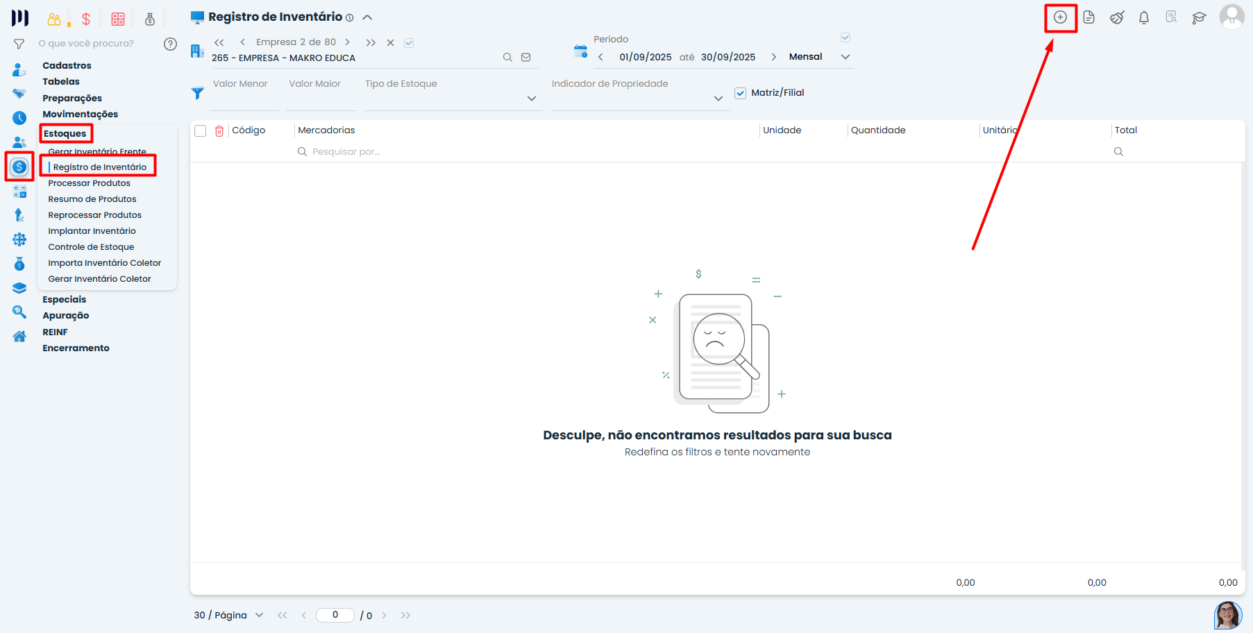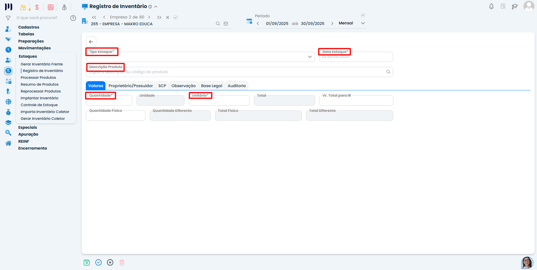 Navegue até Fiscal > Estoque > Registro de Inventário e inclua um novo registro.